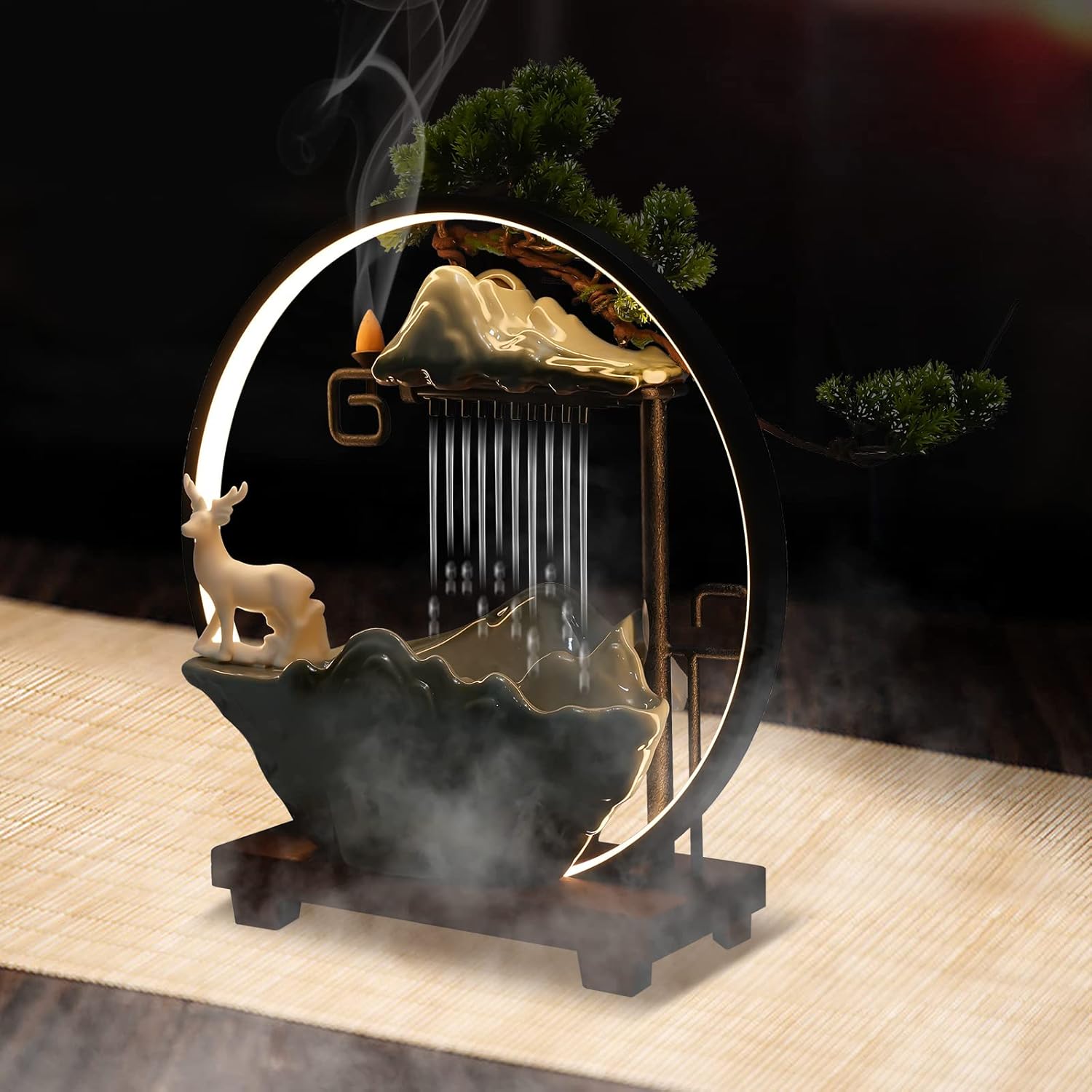 DescriptionWhen it comes to stress and anxiety, you need the gentle, relaxing sound of water to help ease your rushed mind and tense body. That's why we created this indoor water fountain with mist. Not only can it be an unexpected decorative piece, it can also be a soother for your soul. You can place it in any occasion such as living room, store, yoga, spa, and meditation room.Key FeaturesAmazing Visual Effect: It has a LED light loop emitting warm and soft light with the flow of the waterfall, adding a sense of dynamics.Touch Switch: There is a touch switch to control the LED light to make your operation easier.SpecificationColor: Green+BlackMaterial: Ceramic, Iron, WoodSpecial Feature: LED Light, Backflow Incense, MistPower Source: Corded ElectricLight Color: Warm LightPlug Type: USVoltage: 110v, 60HzPackage Size: 37*37*20cm/14.6*14.6*7.9inProduct Size: 35*18*38cm/13.8*7*15inGross Weight: 3.5kg/7.7lbsNet Weight: 3.1kg/6.8lbsInstallation1. Embed the LED light loop into the groove of the wood base.2. Put the water hose into the hole in the reservoir (the biggest mountain).3. Place the switching device of the pump in the reservoir.4. Pull the plug of pump out of the reservoir.5. Place the reservoir on the wood base.6. Place the smaller mountain on the iron support frame.7. Put the deer on the platform of the reservoir.8. Put the the fake plants in the groove of the smaller mountainPackage Included1*Indoor Water Fountain with Mist1*Nebulizer3*AdaptorsAll Accessories for AssemblyNotesPlease make sure there are 3 electric outlets to achieve best performance.Please note that stones, real plants in planter and incense are not included.