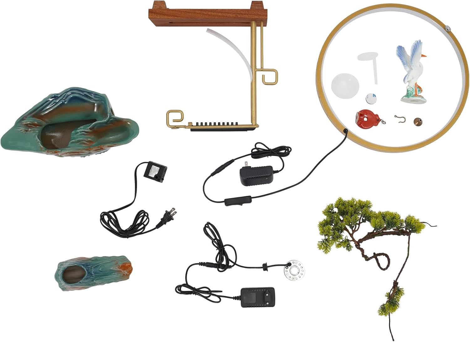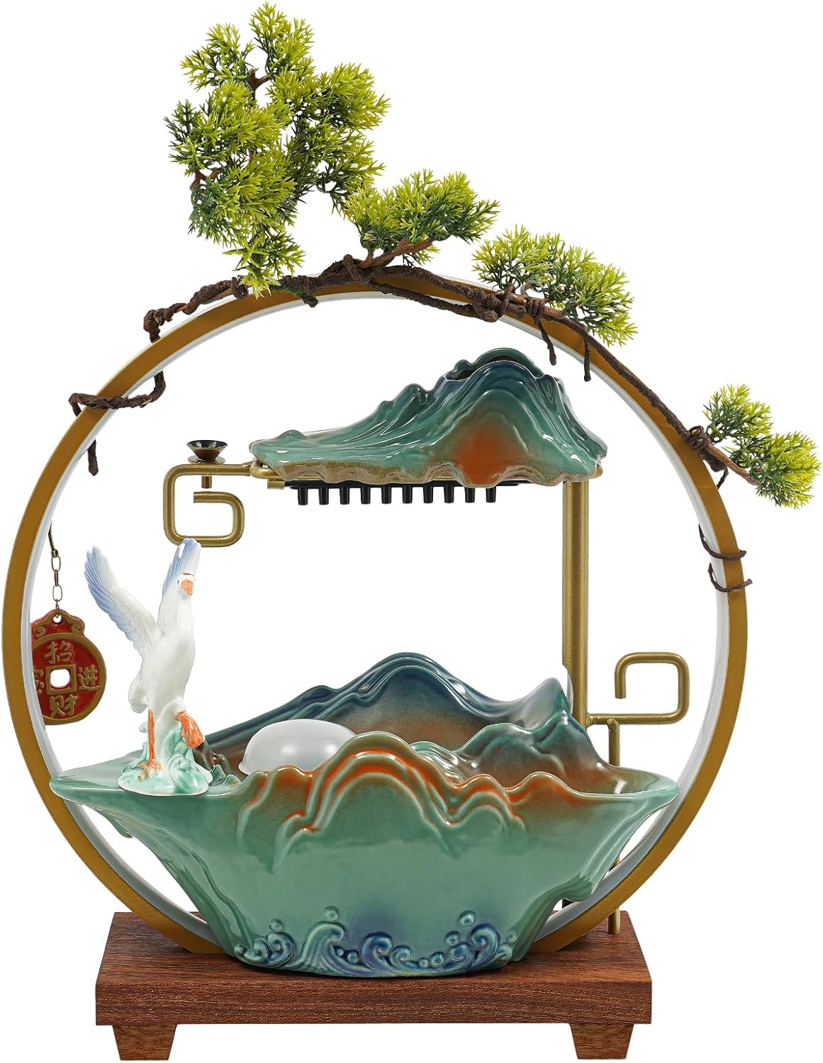 DescriptionIf you feel that your office or living room desktop is too monotonous, then our tabletop water fountain is your ideal choice. It provides you with a great place to soothe your mind. It features a simulated natural landscape with the sound of gurgling water that allows you to embrace nature even inside the house. Come and purchase now, bringing a delicate decoration to your space while healing your soul. DetailsSupport Feet: The thickened feet at the bottom give this product good stability, so you can use it without worrying about sliding or tipping.LED Light: It can illuminate the decoration at night, creating a warm and romantic light and shadow effect, enhancing its decorative value. The switch allows you to control the LED light on or off conveniently. Backflow Incense Bracket: You can fix your favorite incense(not included) on it to transform this product into an incense burner to improve your sleep and meditation. ApplicationIt is suitable for living rooms, bedrooms, dining rooms, yoga rooms, meditation rooms, offices, tea rooms, study rooms, etc. as an ornament. SpecificationColor: Bluish-green, Gold, Wood ColorMaterial: Ceramics, WoodAssembly Required: YesMounting Type: Tabletop Power Source: Corded ElectricPlug Type: US StandardLight Source Type: LEDAdapter Input Voltage: AC100-240V 50/60HzWater Pump Voltage: AC 100-120V 60HzWater Pump Power: 3W Product Size: 35.05*13.97*38.1cm/13.8*5.5*15in Package Size: 37*36.5*20cm/14.57*14.37*7.87inGross Weight: 3kg/6.61lbsNet Weight: 2.85kg/6.28lbsPackage Included1* Tabletop Water Fountain 1* Water Pump1* Atomizer1* LED Lamp RingOther Accessories for AssemblyNotes 1. Please note that except for the guest-greeting pine, the reverse flow incense and other green plants are not included in the packaging.2. Please do not turn on the water pump without water. Please regularly change the water and clean the water pump to prolong its service life.3. Please allow the slight color difference caused by the shooting light and 1-3cm error due to manual measurement, and make sure you do not mind before ordering.
