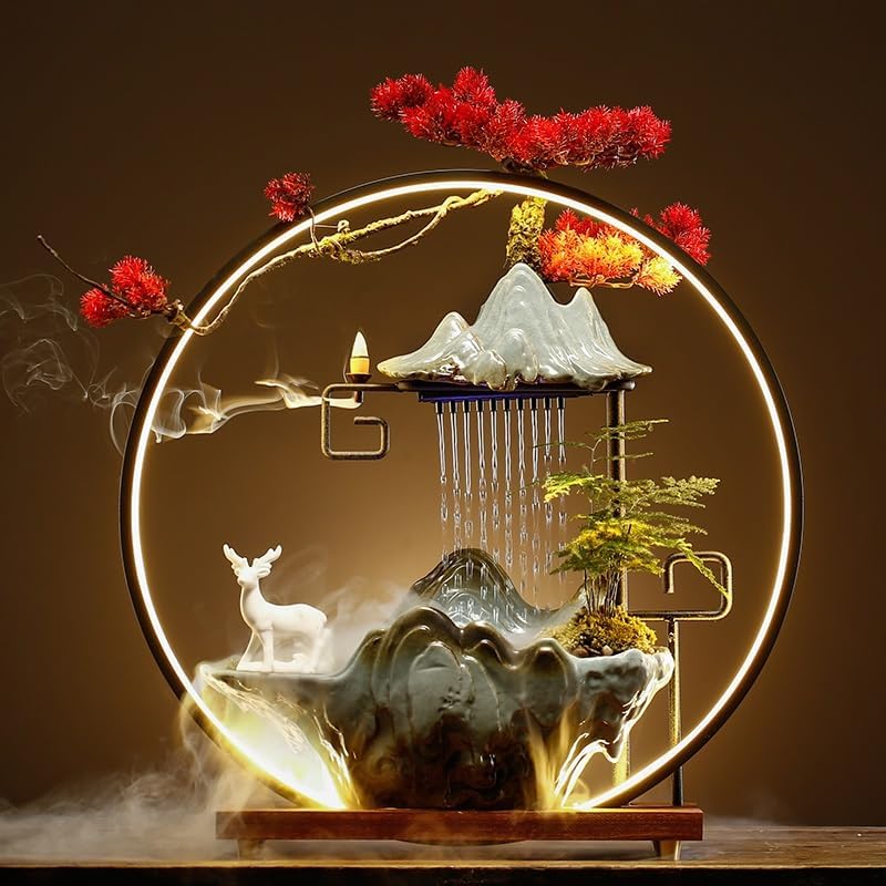 Decorative Tabletop Fountain: Bringing a sense of calm and decoration to any room, the fountain creates a soft, soothing stream of water, recreating the sight and sound of a tranquil springProduct name: Desktop fountainProduct material: wood + ceramic + metal + light ringProduct packaging: Desktop fountain * 1 (the product does not include incense cones and plants)Notes:Please confirm the product size and color before purchasingProducts other than the products shown in the main picture are for display only and are not included.Due to differences in lighting, display and personal color, there may be color differences between the actual product and the photo. Please refer to the actual product.The above data is for reference only. The size is measured manually and there will be an error of 0-2cm. Please refer to the actual product. Thank you.