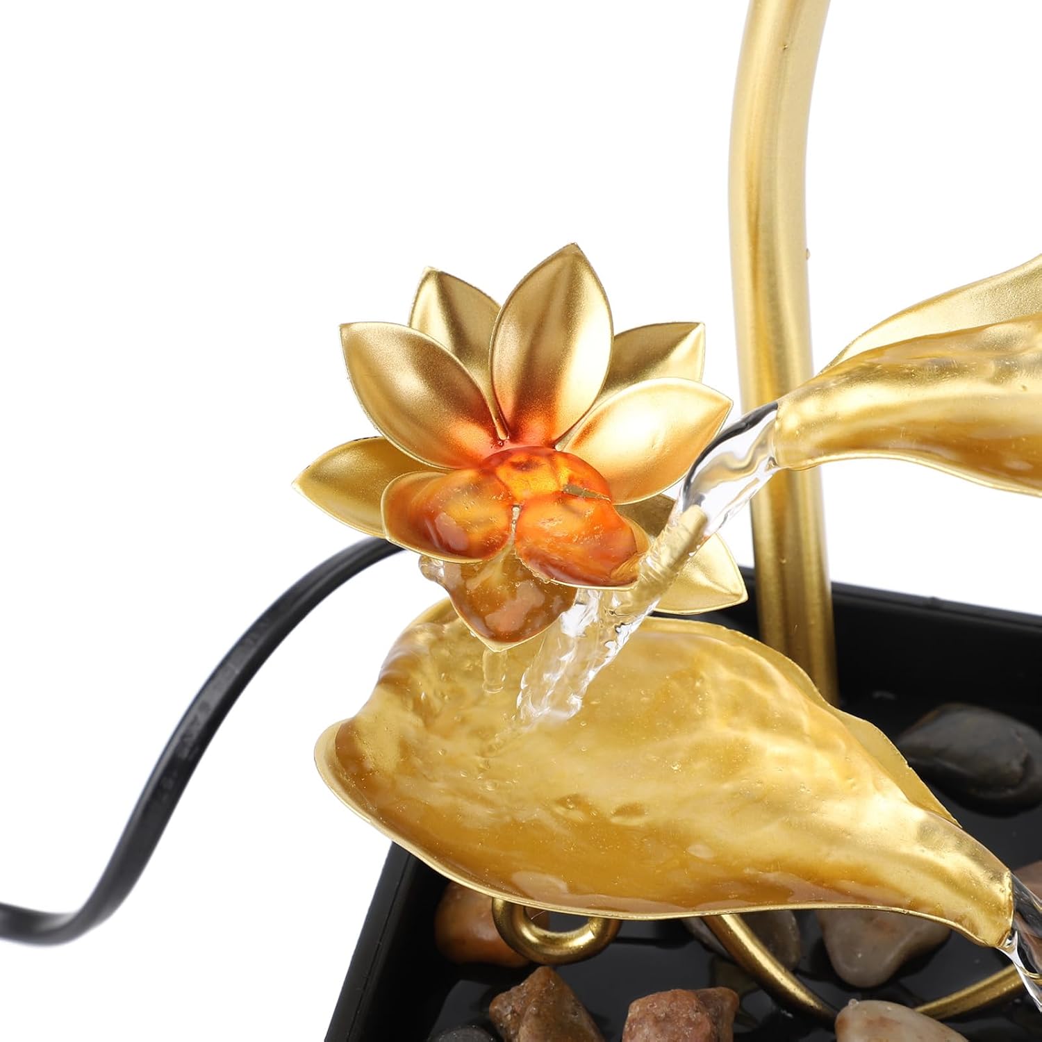 1. Premium Material: Crafted from premium iron and plastic materials, the tabletop waterfall fountain is sturdy, reliable, and long lasting for extended operation. 2. Silent Operation: Equipped with a quiet water pump, the tabletop water fountain ensures silent operation in a peaceful environment without disruptive noise. 3. Circulating Flowing Water and Adjustable: The features constant water circulation to bring you unceasing wealth, And the adjustable settings allow you to control water and prevent spillage onto the table. 4. Warm Lighting: The indoor desk water fountain features led lights for a soft ambient light at night, energy efficient, reliable, and aesthetically pleasing. 5. Compact Size: Small and lightweight design of this desk relaxation waterfall fountain allows for easy portability, convenient placement, and minimal space occupation. 6. Easy to Use and Install: With simple installation and operation, the leaf water fountain is easy to install without the need for additional pipelines, just assemble following the provided steps. Specification: Item Type: Leaf Water Fountain Power: USB 5V Water Pump: USB single lamp water pump Light Color: Warm Light Material: Iron, Plastic Size: Approx. 215 x 130 x 130mm / 8.46 x 5.12 x 5.12in Application: Suitable for living room, bedroom, study, office, coffee table decoration, TV cabinet decoration Weight: Approx. 850.00g / 29.98oz How to Use: 1. Submerge the water pump in water. 2. Plug in the power supply to turn it on. packing list: 1 x Water Fountain 1 x Base 1 x USB Pump 1 x Pack of Stone Accessories Note: With irregular stone, stone accessories quantity is variable per package.
