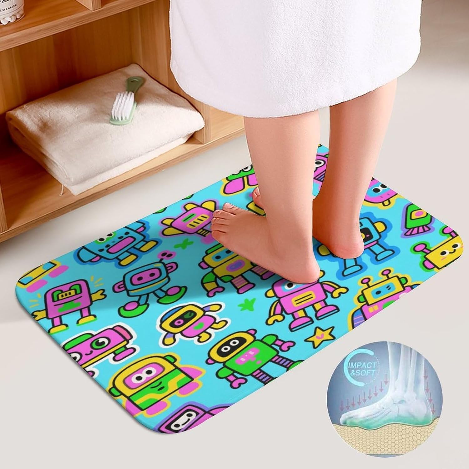 • Super absorbent: This Cartoon Robot floor mat not only has a soft touch, but also has strong water absorption performance. The special fiber structure of coral fleece fabric can quickly absorb water