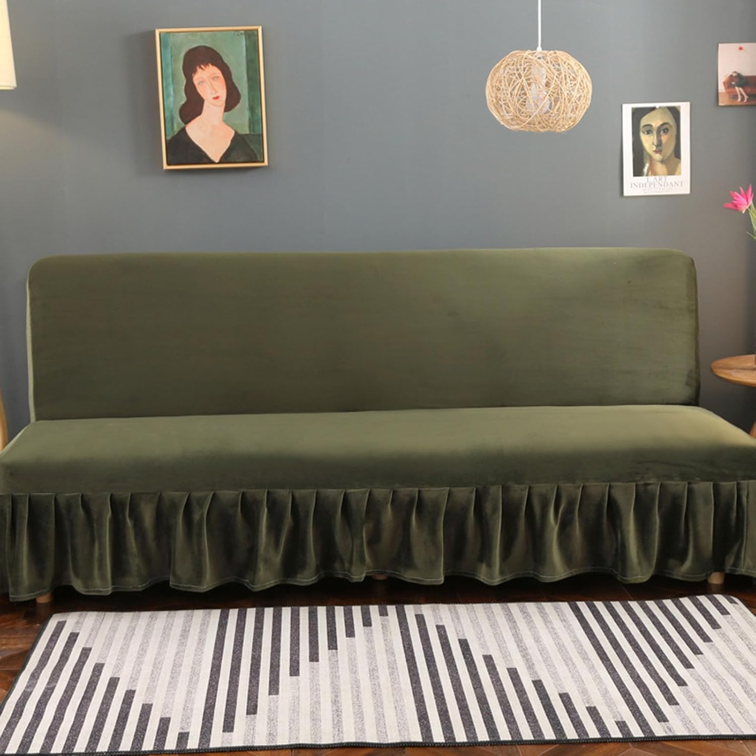 Product DescriptionRuffle Velvet Futon Cover with Skirt, Stretch Armless Sofa Bed Cover, Washable Furniture Protector for Living Room and PatioLooking for an easy way to protect and refresh your armless futon? Our stretch velvet cover with ruffle skirt is the solution – decorate your space and keep furniture clean effortlessly. Crafted from luxurious velvet plush fabric, it’s highly stretchy, durable, ultra-soft and fade-resistant, fitting armless futons perfectly while being skin-friendly.This washable cover fully wraps furniture, protecting it from stains, pet hair, scratches and daily dirt. The stylish ruffle skirt adds elegance without hiding your sofa’s shape, elevating room decor easily.Specifications:Product Name: Stretch Velvet Armless Futon Cover with Ruffle SkirtProduct Fabric: Luxury Velvet Plush (High Stretch)Color: Multiple OptionsProduct Features: Full Protection, Fade-Resistant, Easy Cleaning, Chic Ruffle DesignApplicable Scenarios: Armless Futon/Sofa Bed in Living Room, Bedroom, PatioPackage Included:1x Armless Futon CoverNote:Please allow slight size differences (0.4-1.2”) due to manual measurement.The cover should be slightly larger than your futon for optimal fit.Suitable only for armless futons – verify your sofa’s style and size before purchase.Machine wash cold on gentle cycle; do not use bleach.
