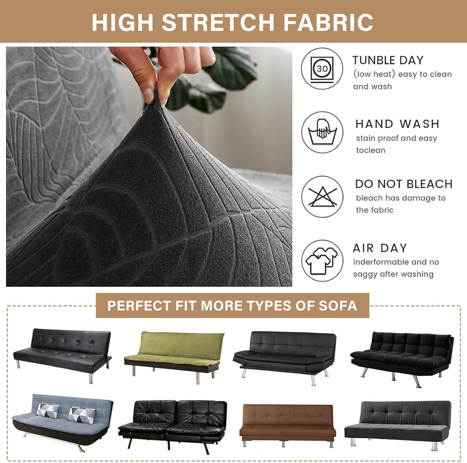 FeaturesThis futon slipcover for furniture sofa is made of 92% polyester fiber + 8% spandex material. This kind of material can make this furniture sofa covers have the elastic recovery ability.Our armless sofa cover is designed for most types of armless sofas, and the all-around coverage will bring a fresh look to your home decor.This high stretch sofa slipcovers come with elastic bands underneath which provide full coverage and protection for your futon. Easy to put on and take off.This covers for sofas are not only be used as a futon cover. There are more using situations you can try. Such as folding sofa bed and low armrest sofa and so on. Whether sitting or lying down, this armrest covers for sofa can bring you a comfortable and beautiful feeling.Installation Steps:Steps 1: Position the slipcover over the sofa with the label at the back.Steps 2: Pull the fabric evenly over the sofa, stretch to fit around furniture, pull fabric down so elastic bottom under the four sides.Steps 3: Adjust the cover to make sure it to fit the furniture.Steps 4: Tuck the extra fabric into the gap between the back and sitting area.Steps 5: Enjoy your newly covered sofa!Kind tips:Colors may be slightly different from what you see due to different monitors or screens.Since the sofa cover is elastic, the size may vary slightly, please understand.This sofa cover is only suitable for armless sofa bed, please check sofa bed style and size.