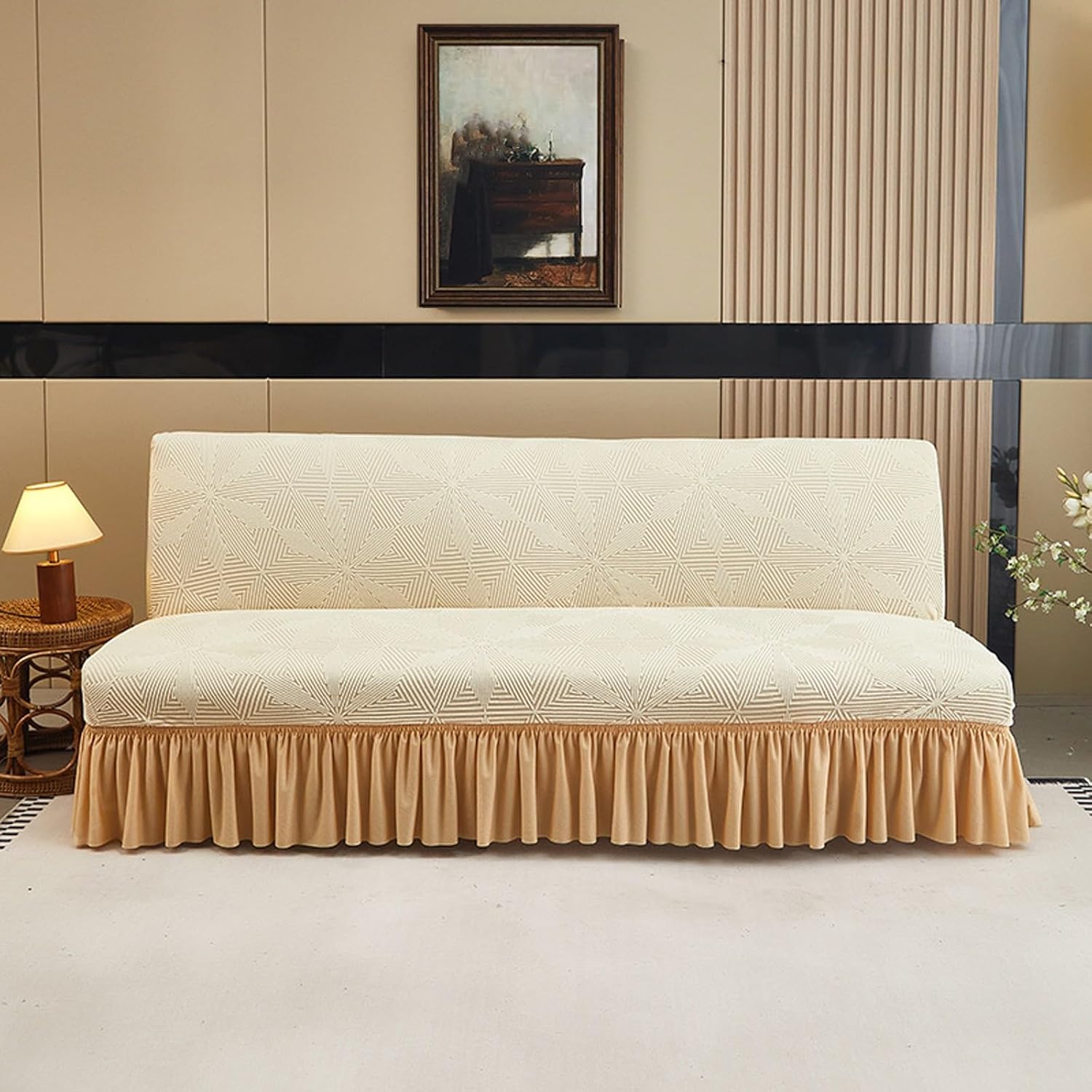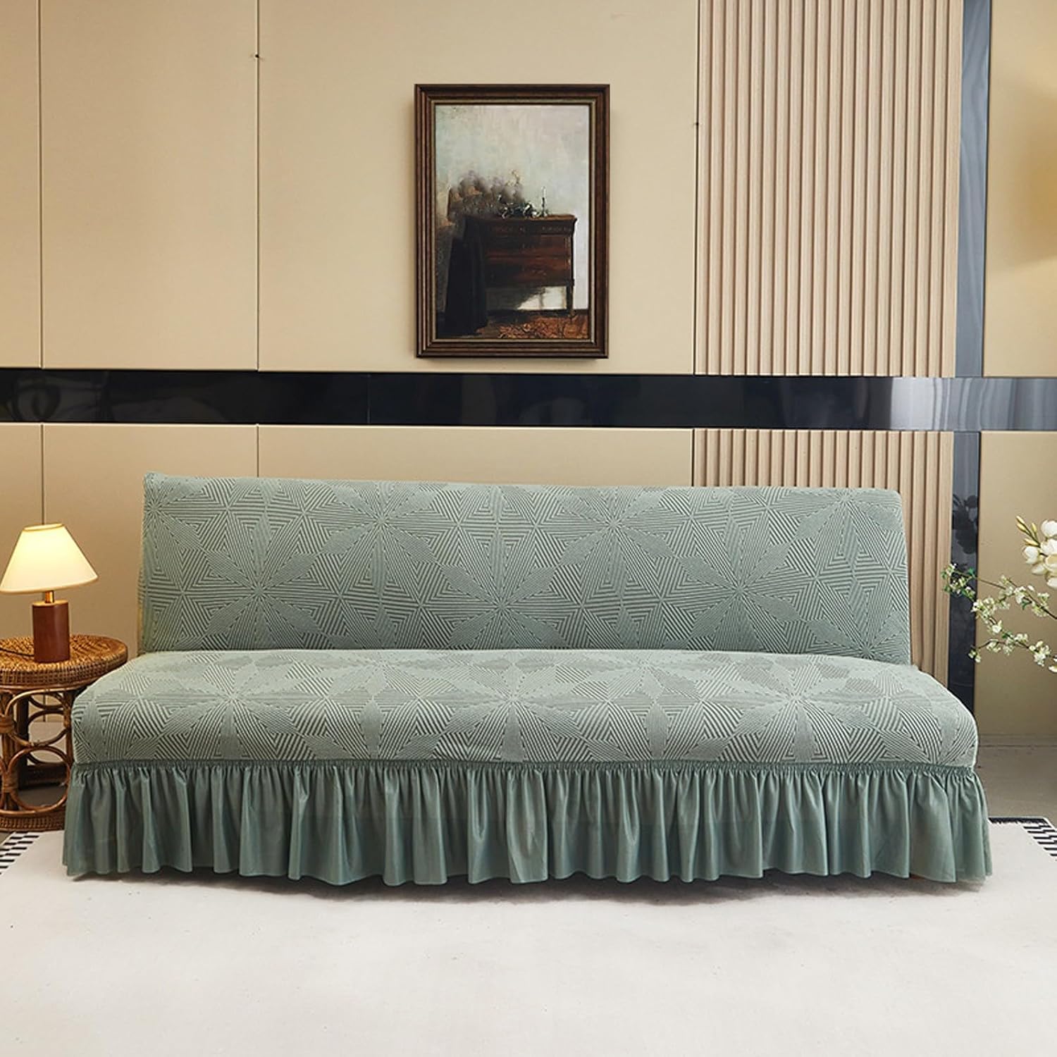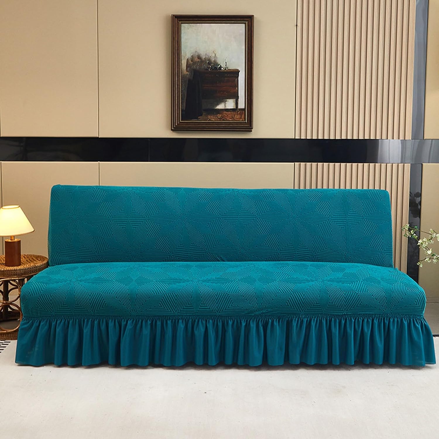 Great Fit: This futon cover has 2 sizes. Small: Sofa length 63-74.8in(160-190cm); Large: Sofa length 74.8-86.6in(190-220cm); Sofa width 15.7-23.6in(40-60cm), Sofa cushion thickness 4-7.8in(10-20cm). Please measure your sofa before purchase High elasticity fabric wrapped soft and obedient, pulling is not easy to deform, durable, wrinkle-resistant and long-lasting. Our sofa bed covers can make your sofa bed a complete space, even covering the back of the sofa. The high elasticity fabric provides comprehensive protection for the sofa. Natural and environmentally friendly, it is a great choice for taking care of children and pets.Specification:Fabric: 95% polyester and 5% spandexStyle: Modern and simpleMachine washableThis armless futon cover has 2 sizes optional:Small: Sofa length 63-74.8in(160-190cm); Large: Sofa length 74.8-86.6in(190-220cm); Sofa width 15.7-23.6in(40-60cm)Sofa cushion thickness 4-7.8in(10-20cm)Please measure your sofa before purchase. If your sofa size is between two sizes, choose the larger onePackage Includes:1 x Futon Sofa Bed Cover