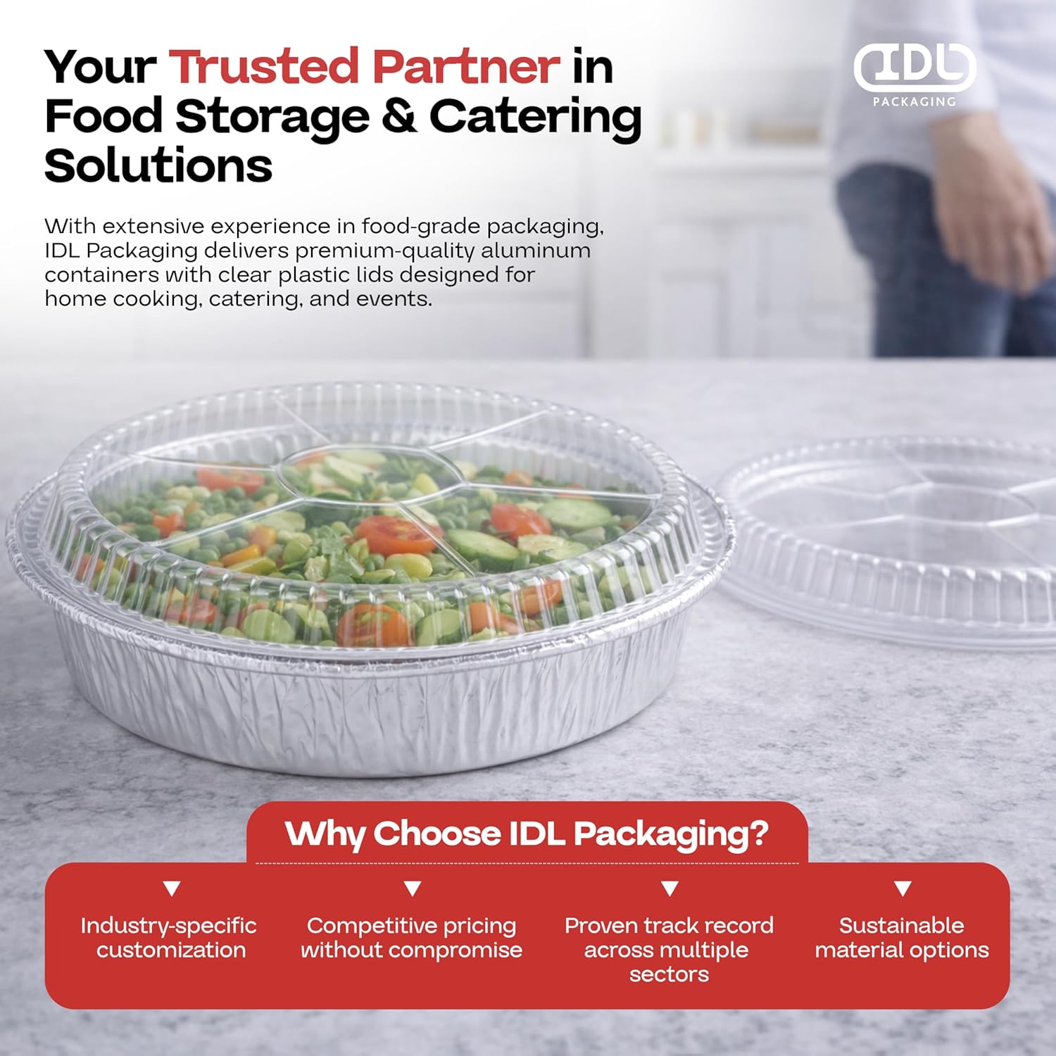 Our Clear Plastic Dome Lids fit perfectly with the 9-inch Round Aluminum Pans. The transparent 9-inch round dome foil pan lids are great for presentations and takeout orders since your customers can see what they are buying without having to open each container. Greatly fit for aluminum foil pans in any food business as well as in household needs. You can be certain your customers are receiving fresh product and warm meal while you present the food at its best.A tall dome shape ensures the icing on top of your pies and cakes will be saved. Flat lids can press into your food, ruining the aesthetic look and messing everything up. Our domed lid will keep your icings and decorations in ideal condition. They are great pie savers. The tall dome shape of the aluminum tray cover allows you to put extra food in your container.With irreplaceable for to go containers clear plastic tops your meals will be in perfect condition and ready for display at any time. In households, the aluminum pans lids guarantee that you will always have your food protected.Sealed with aluminum tins, our plastic covers can be stacked together and transported without any fear of spilling or smashing your foods. Protect your meals from any unfavorable outer impact, reuse them, and discard when no longer in need.Disposable or can be reused several times. You decide whether to throw away this plastic lid after an event skipping the wash-up ritual or give them a rinse and keep it for the future. These dome covers are durable enough to be used several times.Visit our IDL Packaging Amazon Brand Store and find there also aluminum pans with lids, aluminum foil trays, and aluminum foil. Please choose the one that suits your needs best.