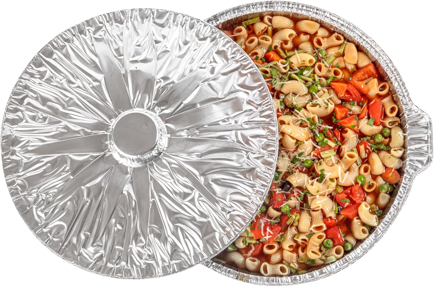 Simplify your cooking and serving process with our Foil Lux 8.5-quart Aluminum Foil Pots. This cookware set comes with lids and pots that offer a comprehensive cooking solution for your culinary needs. Forming a tight seal, these disposable lids lock in heat and ensure your doos stay at the perfect temperature. The attached handles of these aluminum pots offer a secure grip and reduce the risk of accidental spills while carrying them. These pot lids feature a handle on top that provides quick and easy access to your stored food. Made from thick aluminum foil, these pots and lids are durable and designed to withstand the rigors of any kitchen. Compatible with stoves, these casserole pots provide versatility and convenience for preparing a variety of hearty dishes with ease. These cooking pots are oven-ready up to 390F and allow you to transition from stovetop cooking to oven baking. Ideal for batch-cooking soups, stews, or casseroles, these disposable pots are freezable and allow you to prepare meals in advance and store them in the freezer for later consumption. These stew pots are disposable and can be easily discarded to make cleanup a breeze. Ideal for ecologically-conscious chefs, these aluminum cooking pots are sustainable. These soup pots measure 15.4 inches in length by 14 inches in width by 4.7 inches in height and can hold up to 8.5 quarts and are ideal for serving large groups or catering events. Sold in a 10 count box.