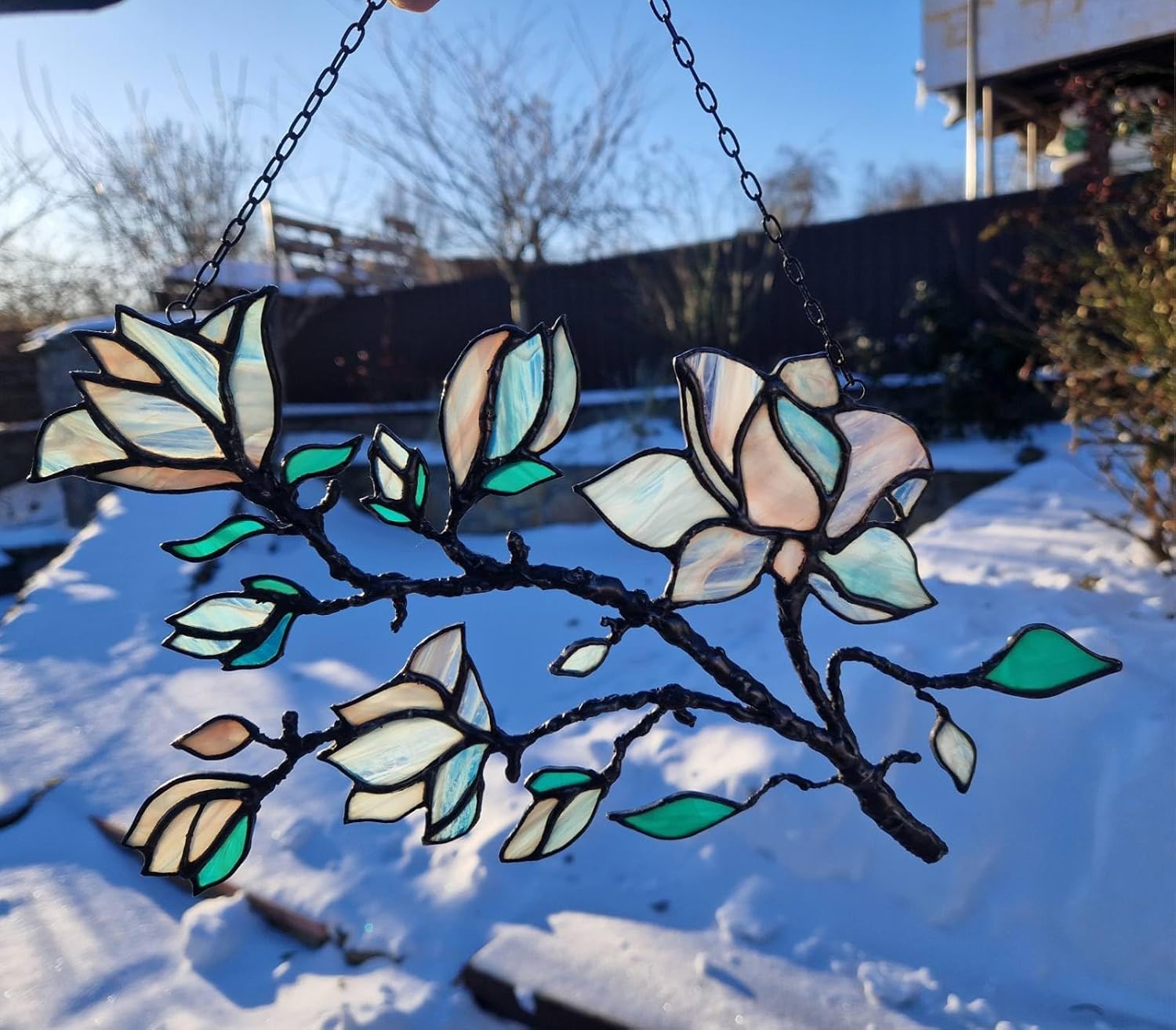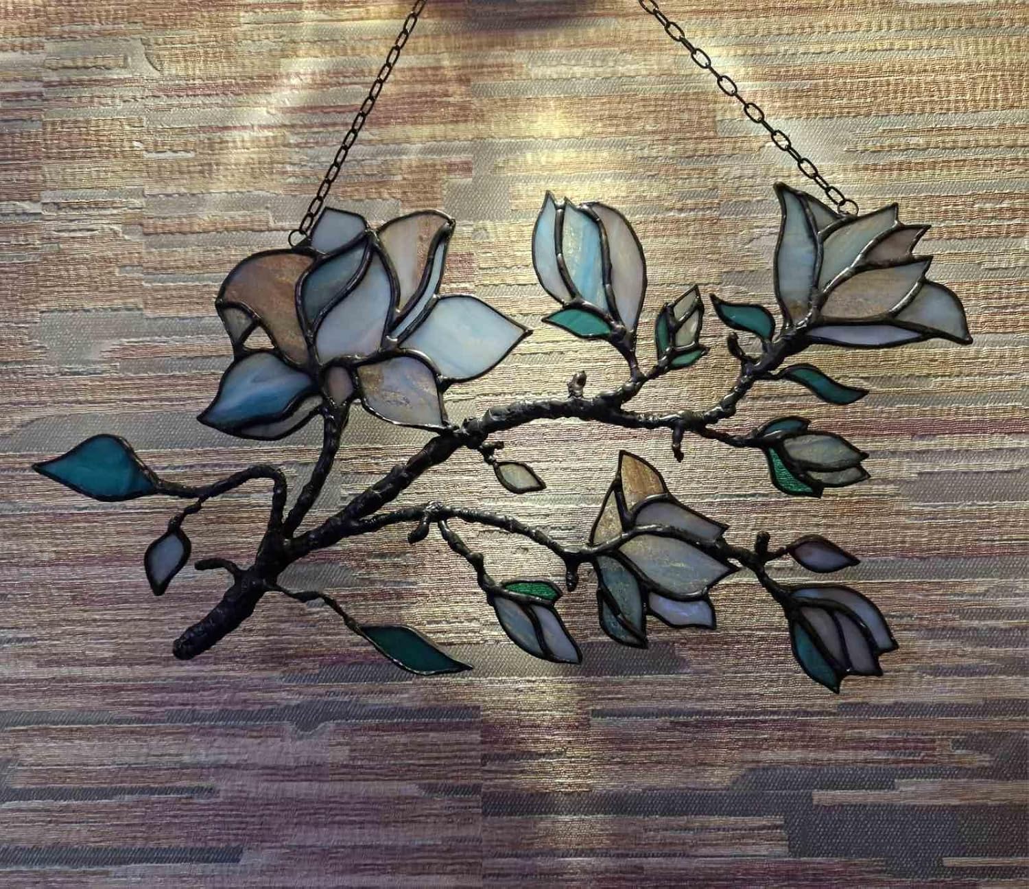 Add a touch of romance to any room with this stunning handmade stained glass suncatcher featuring a beautiful purple magnolia blossom. The Tiffany technique used in production creates a unique and vibrant piece that is ready to hang on wire. The item measures 20 cm in height and 32 cm in width (approx. 7.9" x 12.9"), making it the perfect size for any window. Crafted in Ukraine, this original piece is made of stained glass, solder, copper foil, patina, and copper wire. The suncatcher does not require any additional parts and is suitable for any room in the house.