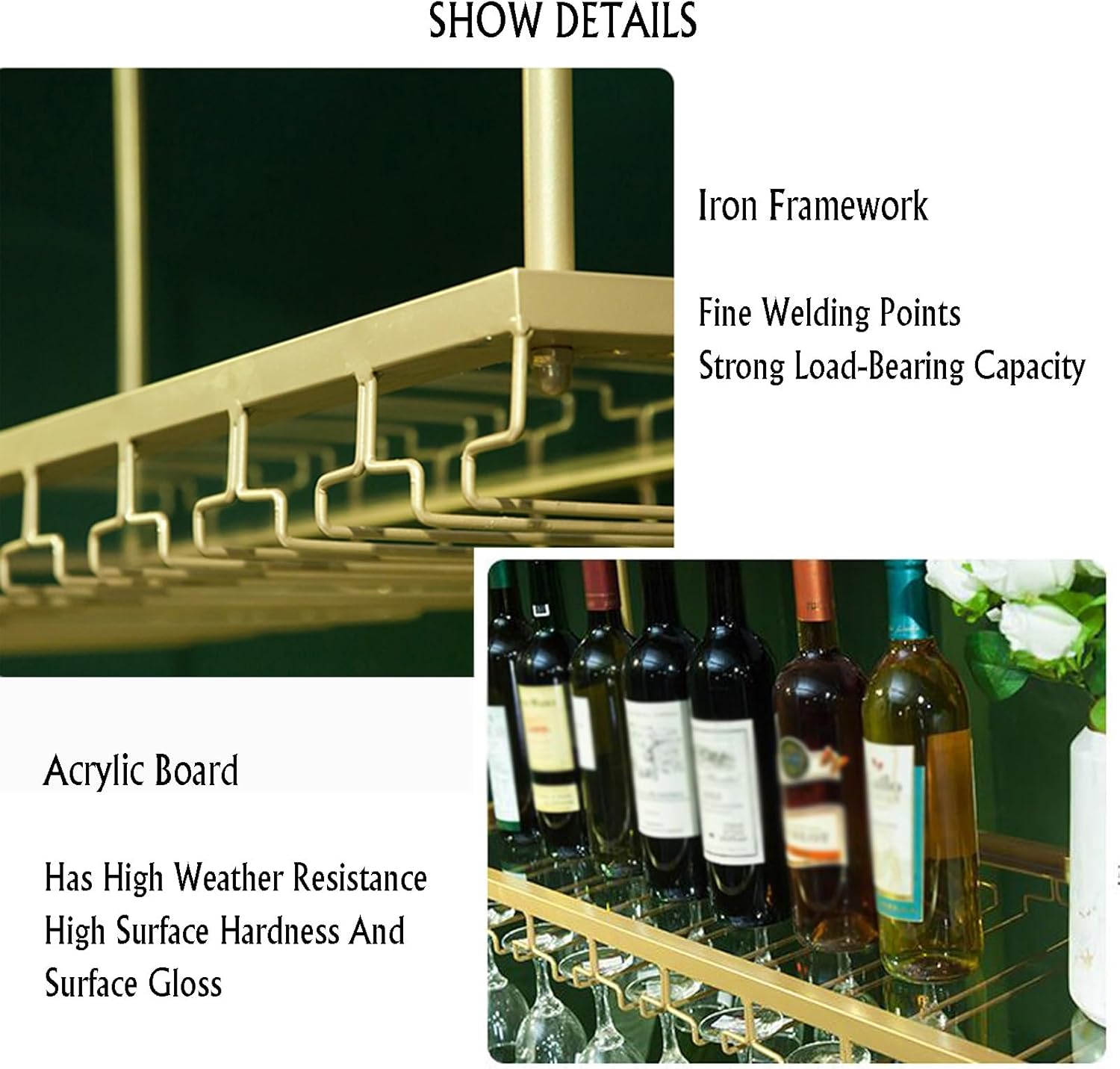 DESCRIPTION:If you are a wine lover, you definitely a wine rack that can both store your collection and display beautiful glasses. This ceiling wine glass rack fulfills that desire. 1. Load Capacity: Our rack is to hold a large number of wine glasses securely, so you can confidently display your collection.2. Universal Goblet Holder: The rack accommodates various types and sizes of wine glasses, making it a versatile choice for any wine-lover.3. Easy to Install: With our user-friendly design, installation is a breeze. Simply follow the provided instructions and use the included mounting accessories for a hassle-free setup.4. Wide Application: This rack is perfect for numerous settings, from intimate family gatherings to bustling wine-tasting events.PRODUCT SPECIFICATIONS:Name: wine rackMaterial: IronColor: GoldFunction: LiftableAssembly Required: YesFeatures: heavy-duty, durableSize: length 60/80/100/120cm, Width 35cmPACKAGE INCLUDES:1 x Ceiling wine rack1 x Mounting accessories and user's GuideNOTES:1.This product is not suitable for plasterboard ceilings as plasterboard does not have enough load-bearing capacity. Customers whose ceilings are cement board or wood board, please buy it with confidence.2.This product does not include wine glasses and other decorations.3.Please allow the slight color difference caused by the shooting light and the 1-3 cm error due to manual measurement, and make sure you do not mind before ordering.NOTICE:If You Have Any Questions, Please Contact Us And We Will Provide A Satisfactory Solution Within 24 Hours