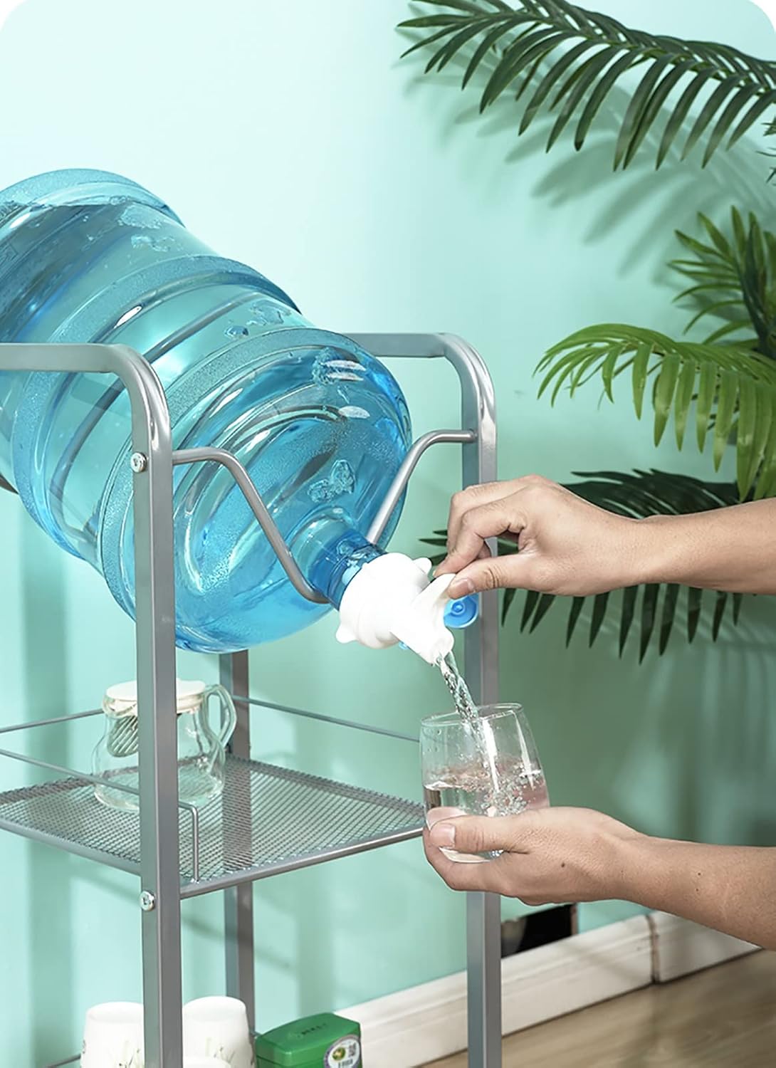 Bulky multi-gallon water bottles occupy a lot of floor space in an office. This 2-tier water bottle jug rack making the bottles organized and save space. You can have easy access to bottles, easy to find and get. Package Includes: 1 x Water Cooler Jug Holder 1 x Valve Specifications: Material: Steel Color: Silver Stand Support: 3 or 5 gallons Overall Dimension: 33 cm x 33 cm x 78 cm (13 in x 13 in x 30 3/4 in) Valve fits: 5.5 cm (2 1/8 in) top water bottles (NOT for bottles with screw tops) Features: Easy to assemble, no other tools need. Made of metal to be stable and durable. Suitable for home, kitchen, office, break room and classroom. High-quality steel ma it waterproof, dust-proof and rust-proof. ep your water gallons off the floor and helps you save floor space to ep it neat and clean. Warm Prompt: Due to manual measurement, please allow slight deviation. Due to different monitors and lighting effects, the actual color may be slightly different from the image.