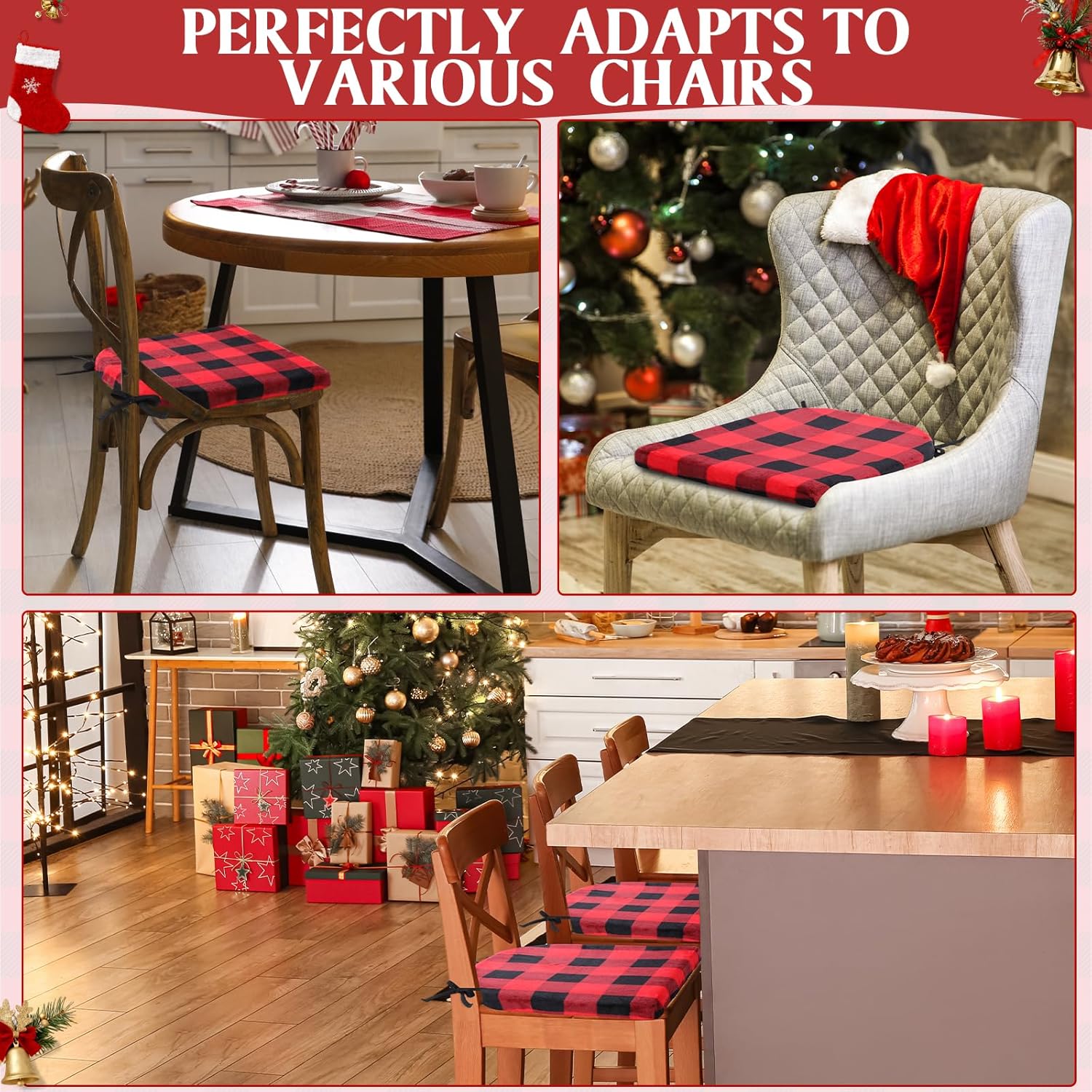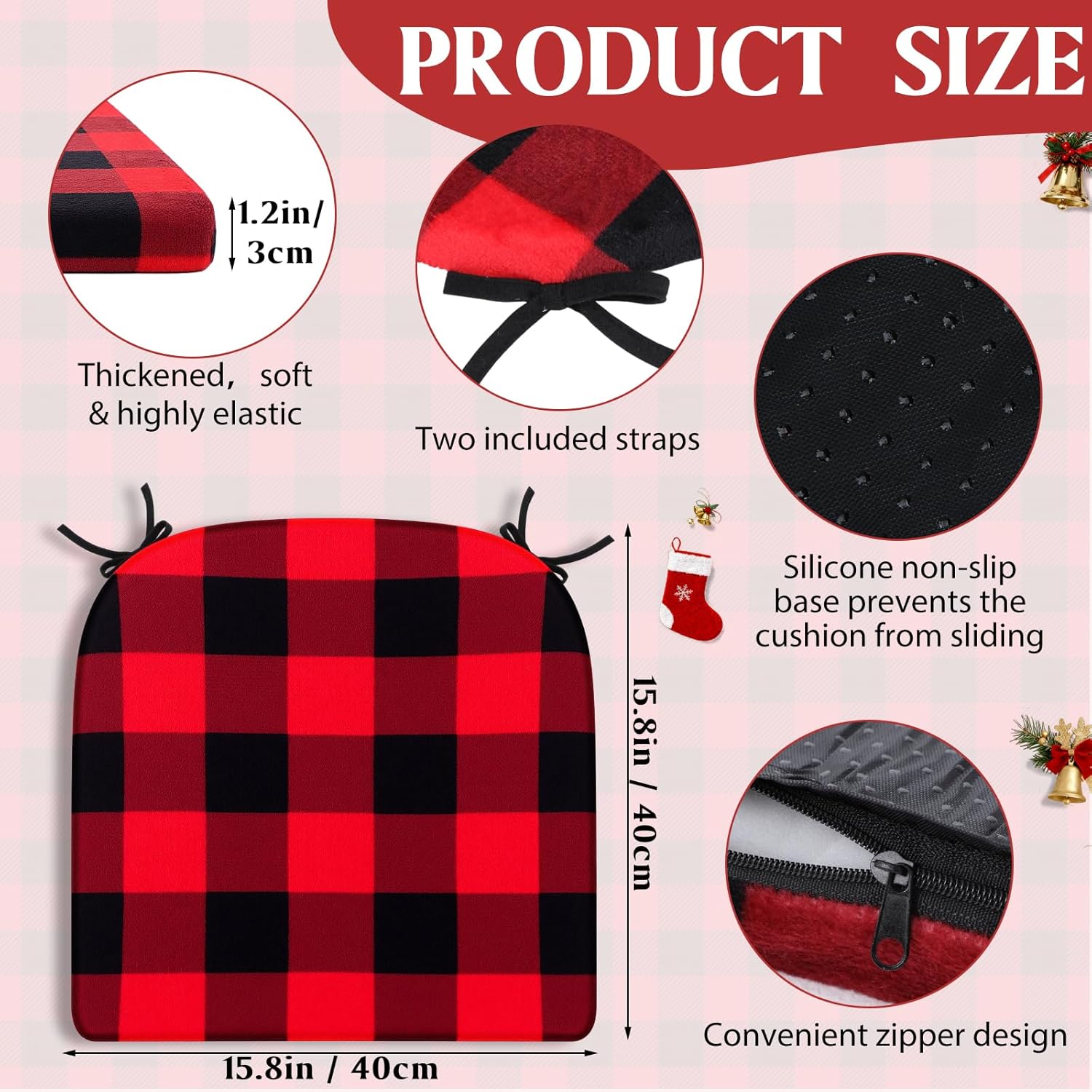 Features: Our chair cushions are the blend of function and festive. The soft coral fleece fabric provides cozy warmth for fall and winter, making them a Christmas essential. Meanwhile, the classic red and black check design ensures they never go out of style, these cushions add daily comfort and rustic charm to your dining experience. Get everything you need in one smart set. This practical 4pack is ideal for decorating a standard dining table without the hassle of buying separate pads. Value and convenient for kitchen chairs, bar stools, or study seating. Specifications: Material: coral fleece, sponge Size: 15.8 x 15.8 x 1.2 inches/ 40 x 40 x 3 cm Package includes: 4 x Dining chair cushions Notes: Manual measurement, please allow slight errors on size. The color may exist a slight difference due to different screen displays