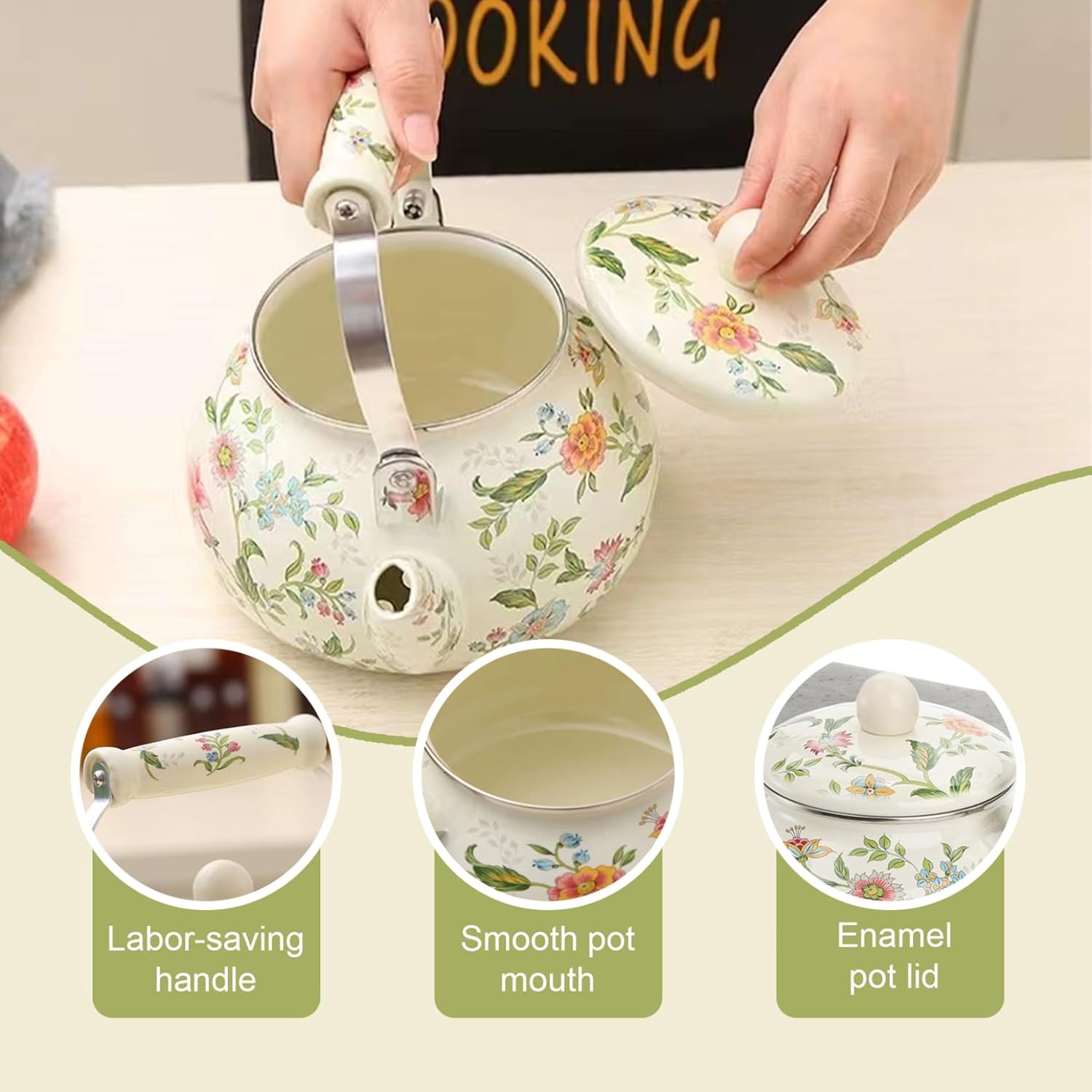 Description: Add a touch of charm to your kitchen with this Vintage Floral Enamel Tea Kettle! Featuring a 2.6 Quart/2.5L capacity, it's perfect for brewing your favorite teas or boiling water for hot drinks. The anti-scalding porcelain handle ensures safe and comfortable handling, while the enamel-coated surface long-lasting beauty. With its timeless floral design, this kettle doubles as a lovely home décor piece, making it a thoughtful for Christmas, housewarming, or weddings. Features:. Cute Tea Kettle. -Color: As shown. -Material: Enamel. - Size: Handle: 12 cm/4.72 inch. Mouth height: 11 cm/4.33 inch. Height including handle: 23 cm/9.06 inch. Bottom diameter: 16 cm/6.30 inch. -Capacity: 2.5L Note: Manual measurement, please allow slight errors on size. The colors may exist slight difference due to different screens. Package Including 1 * Cute Tea Kettle
