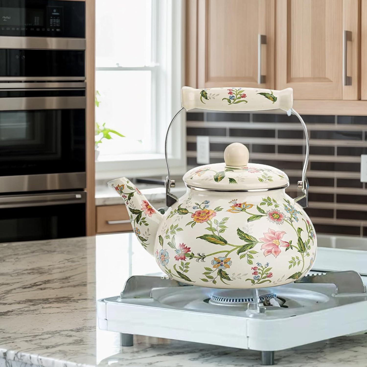 Description: Add a touch of charm to your kitchen with this Vintage Floral Enamel Tea Kettle! Featuring a 2.6 Quart/2.5L capacity, it's perfect for brewing your favorite teas or boiling water for hot drinks. The anti-scalding porcelain handle ensures safe and comfortable handling, while the enamel-coated surface long-lasting beauty. With its timeless floral design, this kettle doubles as a lovely home décor piece, making it a thoughtful for Christmas, housewarming, or weddings. Features:. Cute Tea Kettle. -Color: As shown. -Material: Enamel. - Size: Handle: 12 cm/4.72 inch. Mouth height: 11 cm/4.33 inch. Height including handle: 23 cm/9.06 inch. Bottom diameter: 16 cm/6.30 inch. -Capacity: 2.5L Note: Manual measurement, please allow slight errors on size. The colors may exist slight difference due to different screens. Package Including 1 * Cute Tea Kettle
