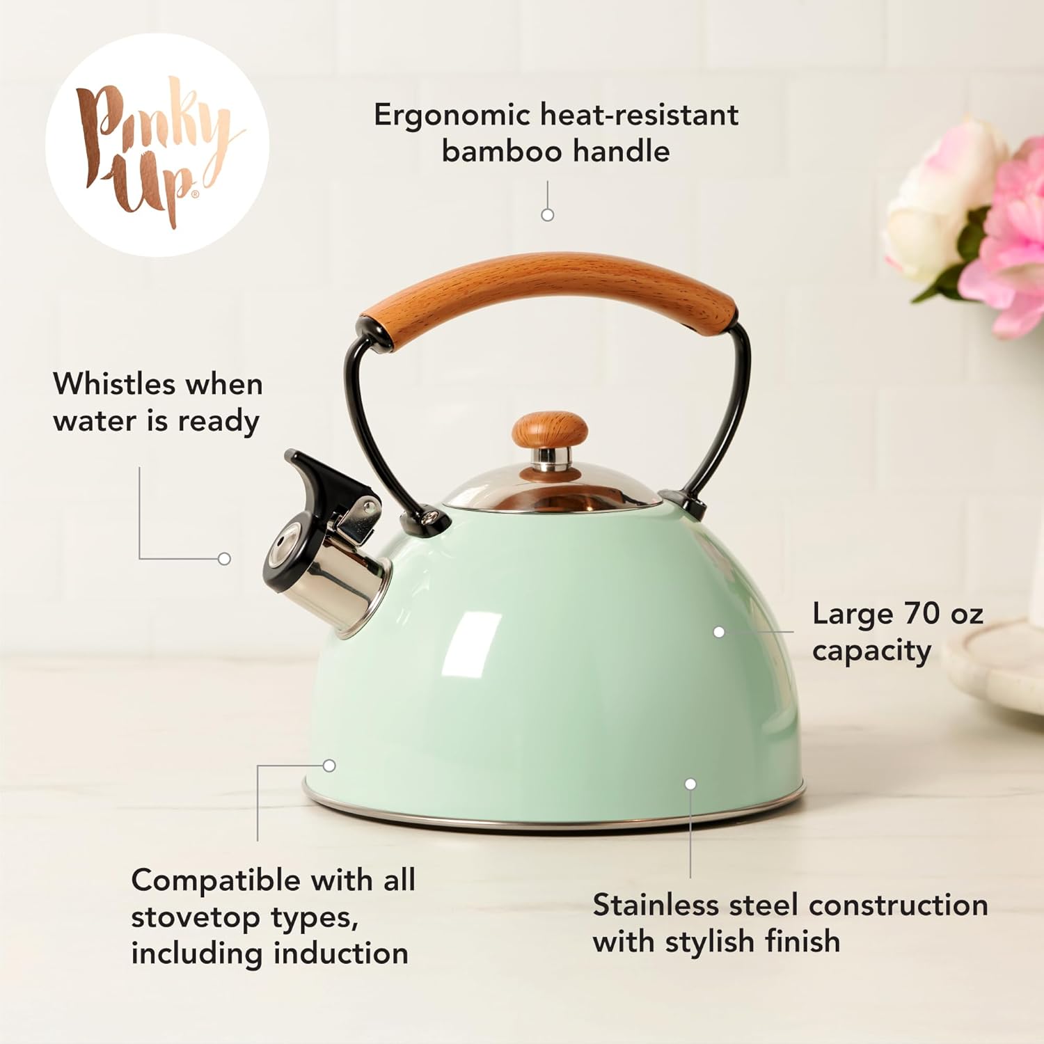 Experience the perfect blend of tradition and modern design. This 70 oz stove kettle is crafted with stainless steel with a stylish finish. Designed with an ergonomic, heat-resistant bamboo handle and push-button spout for effortless pouring, this kettle whistles to signal when your water is ready. Suitable for all stovetop types, it’s a functional and beautiful addition to any kitchen. 70 oz capacity for large servings Whistles to alert when water boils Works on all cooking surfaces Durable stainless steel construction Stylish polish finish with bamboo handle