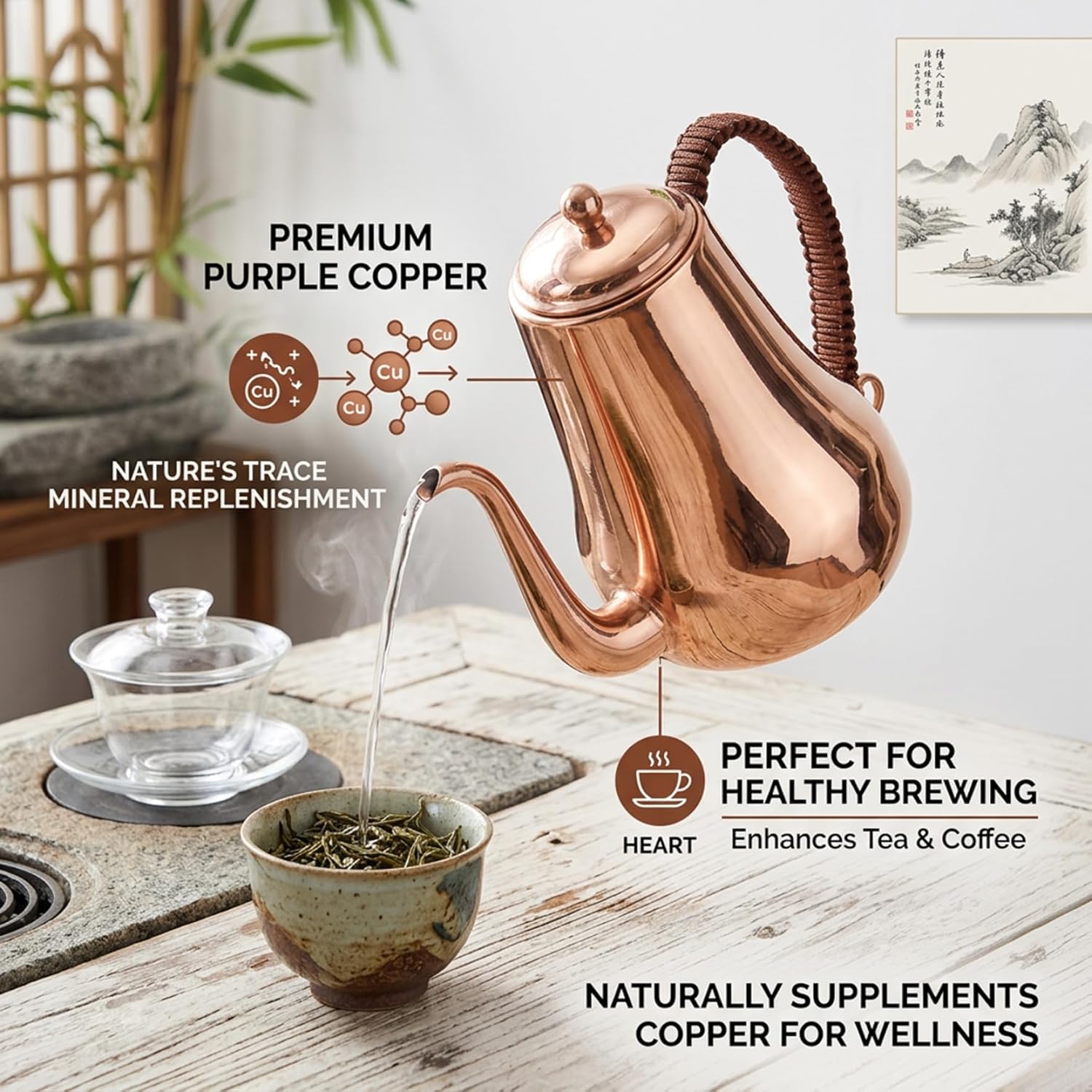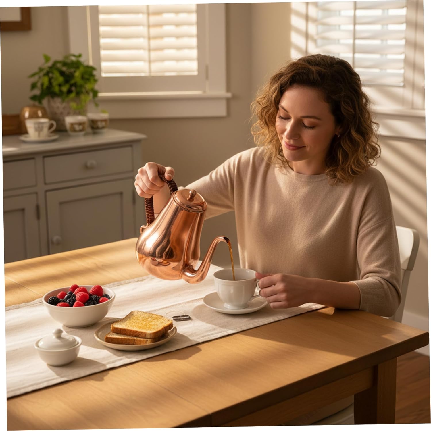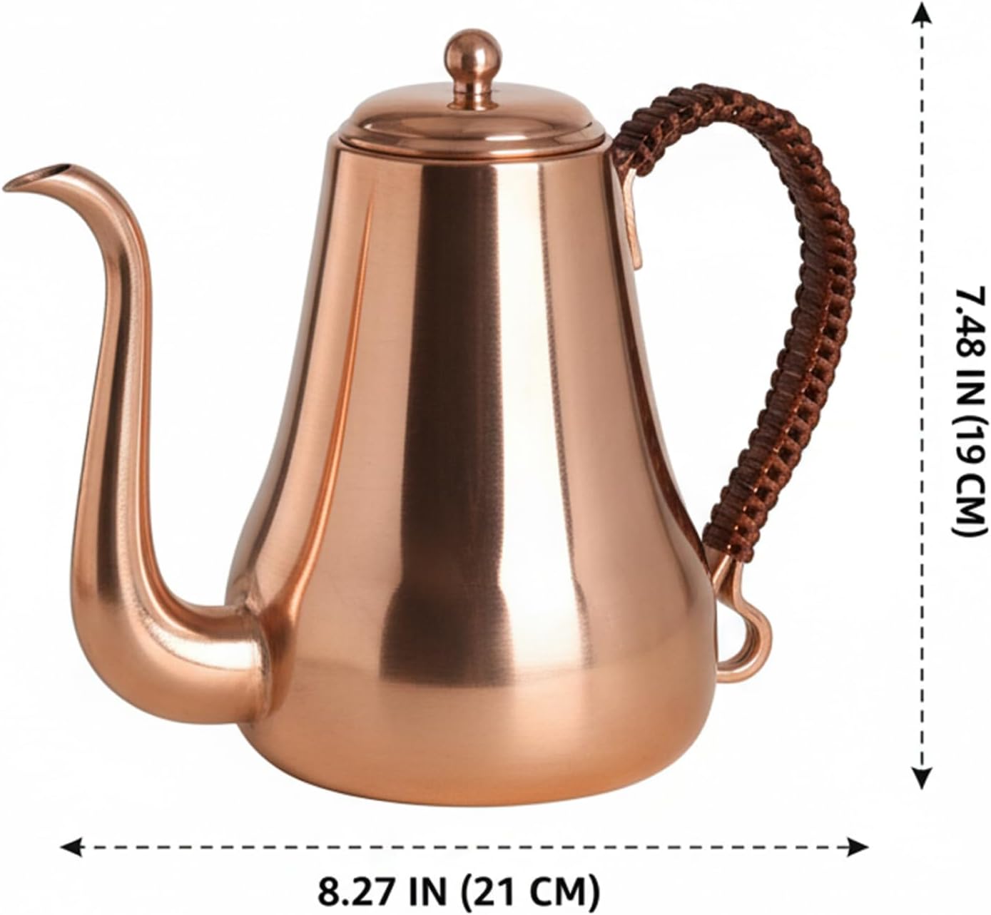 Description: Elevate your daily coffee or tea ritual with the timeless elegance and functionality of our Handmade Copper Gooseneck Kettle. Expertly crafted by artisans, each kettle showcases the beauty of traditional hammered metalwork, making it a unique centerpiece for your kitchen.Constructed from high-quality, copper, this kettle boasts a natural, coating-free interior. This design prioritizes simplicity and safety for your brewing needs. The classic brown copper finish develops a rich patina over time, adding to its distinctive character.The defining feature is the precision gooseneck spout. It allows for a slow, steady, and controlled pour, giving you use over water distribution. This is essential for mastering pour-over coffee techniques, ensuring even extraction for a perfectly balanced cup. It's equally superb for steeping loose-leaf tea with precision.With a practical 1-liter (33oz) capacity, this kettle meets the needs of both individual enthusiasts and small gatherings. Please note that slight variations in dimensions may occur due to its handmade nature, a testament to its artisanal quality. Always use with appropriate stovetop heat sources and avoid direct exposure to open flames.Discover the blend of artisan craftsmanship and brewing performance with this classic copper tea kettle. Features:. -Color: Brown. -Material: Copper. -Size: Capacity: 1L/33oz. Note:Manual measurement, please allow slight errors on size.The colors may exist slight difference due to different screens. Package Including 1 * Copper Tea Kettle