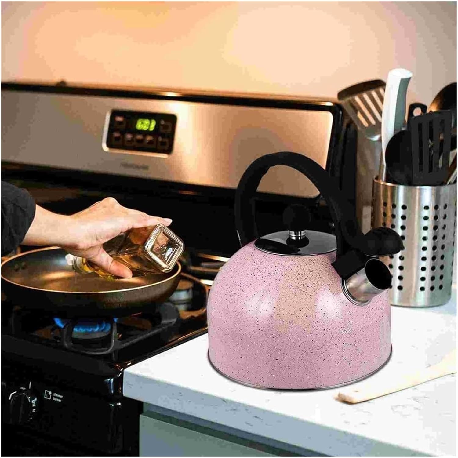 Introducing the BMPAALN Whistling Tea Kettle Stovetop, a perfect blend of functionality and style. Crafted from stainless steel, this Whistling Tea Kettle ensures durability and a long-lasting performance. Its encapsulated bottom heats up quickly and distributes heat evenly, making it perfect for a quick and efficient boiling experience.This versatile Whistling Tea Kettle is compatible with gas, induction, and halogen stoves, providing you with the flexibility to use it on any stovetop. The convenient trigger mechanism on the handle and the one-finger flip spout design ensure safe and easy pouring, preventing any spills or burns. The removable lid allows for easy filling and cleaning, making your tea preparation hassle-free.With its sleek metallic color and elegant design, the BMPAALN Whistling Tea Kettle not only serves as a functional kitchen tool but also adds a touch of sophistication to your kitchen décor.Specification:Name: whistling kettleMaterial: stainless steelSpecification: 2.5L.packing list:Whistle kettle * 1Experience the perfect combination of style, safety, and efficiency with the BMPAALN Whistling Tea Kettle Stovetop, and enjoy your tea time like never before.