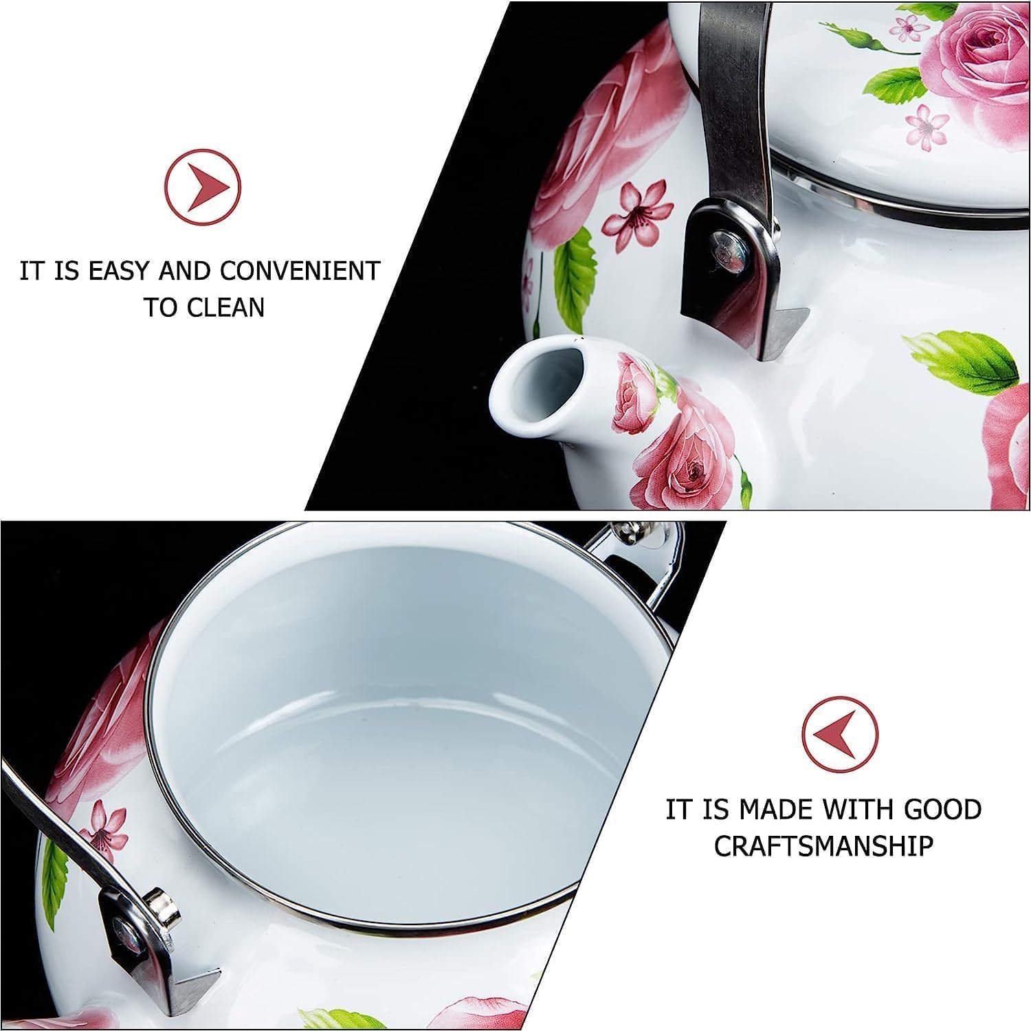 Features - Size: 24. 00X18. 00X16. 00cm/ approx 9. 43X7. 07X6. 29inch. - Color: Assorted Color. - Material: Enamel. - Suitable for a variety of teas, fruit teas, black teas, dark teas, scented teas, etc. - A to make a cup of coffee or tea and bring you a good mood. - The bottom has good heat resistance and long service life, suitable for induction and gas stoves. - High thermal conductivity, greatly reducing the time for water to boil. Package Including 1 x enamel tea kettle
