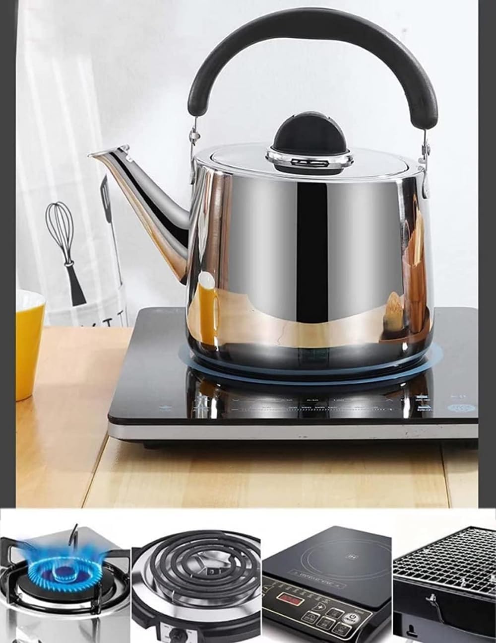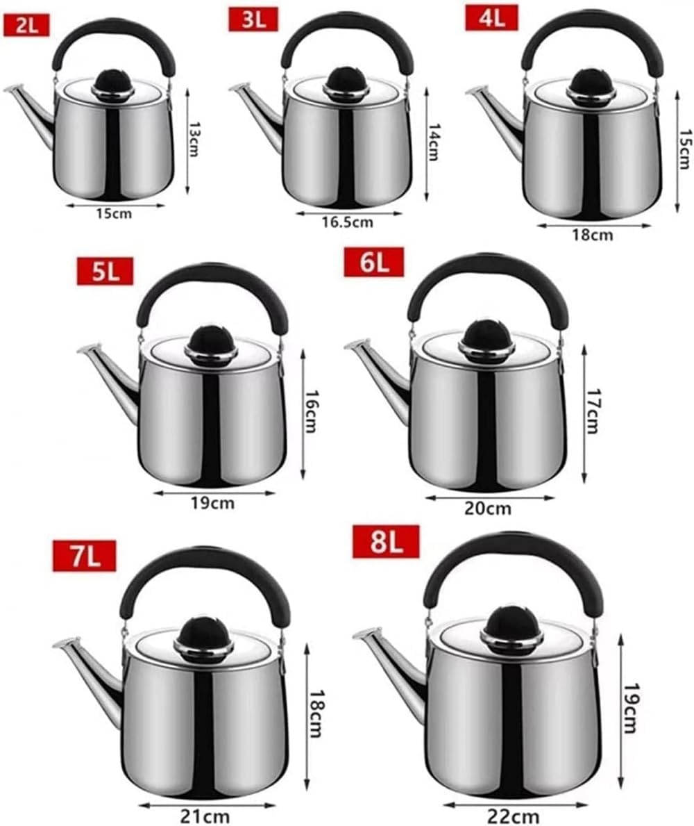 It can be used to boil water for tea, coffee or even hot chocolate , and make cups of warm milk.Features:1.304 stainless steel material.2.Anti-scalding bakelite handle.3.Large diameter opening mouth,easy to inject water.4. Kettle lid with whistle piece.5.Thickened composite pot bottom.Parameters:Material:304 stainless steelCapacity:3L/4L/5L/6L/7L/8LThis is a perfect tea kettle for at- home tea aficionados and professional tea house. you can use it to make a cup of coffee or tea or other drinks you want. with this tea kettle, you can save your time.This whistling teapot could meet the daily needs of your whole family. It could be employed to boil water for coffee, tea, warm milk and so on.Manual measurement, measurement error within 1-2 cm within the normal range