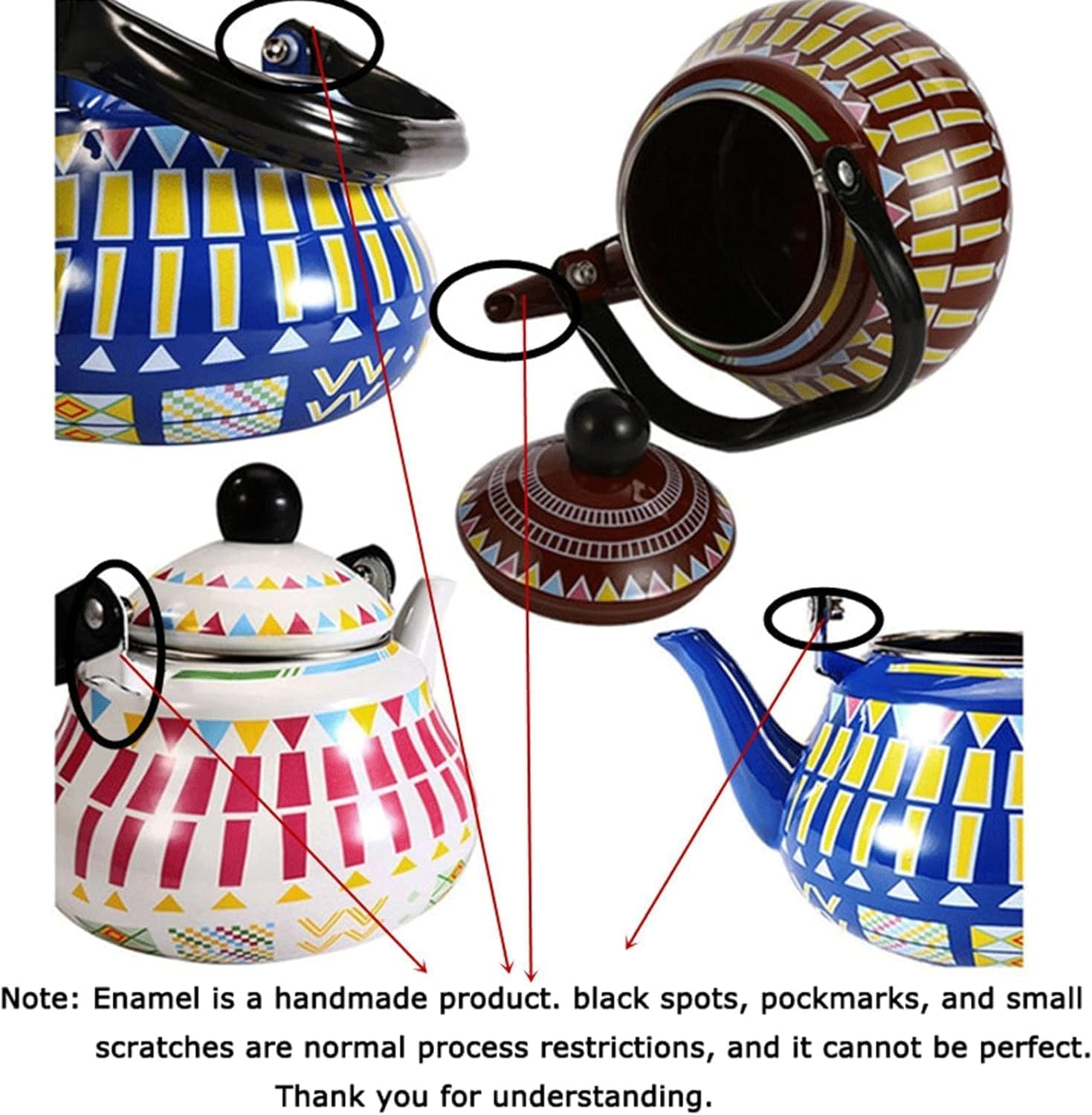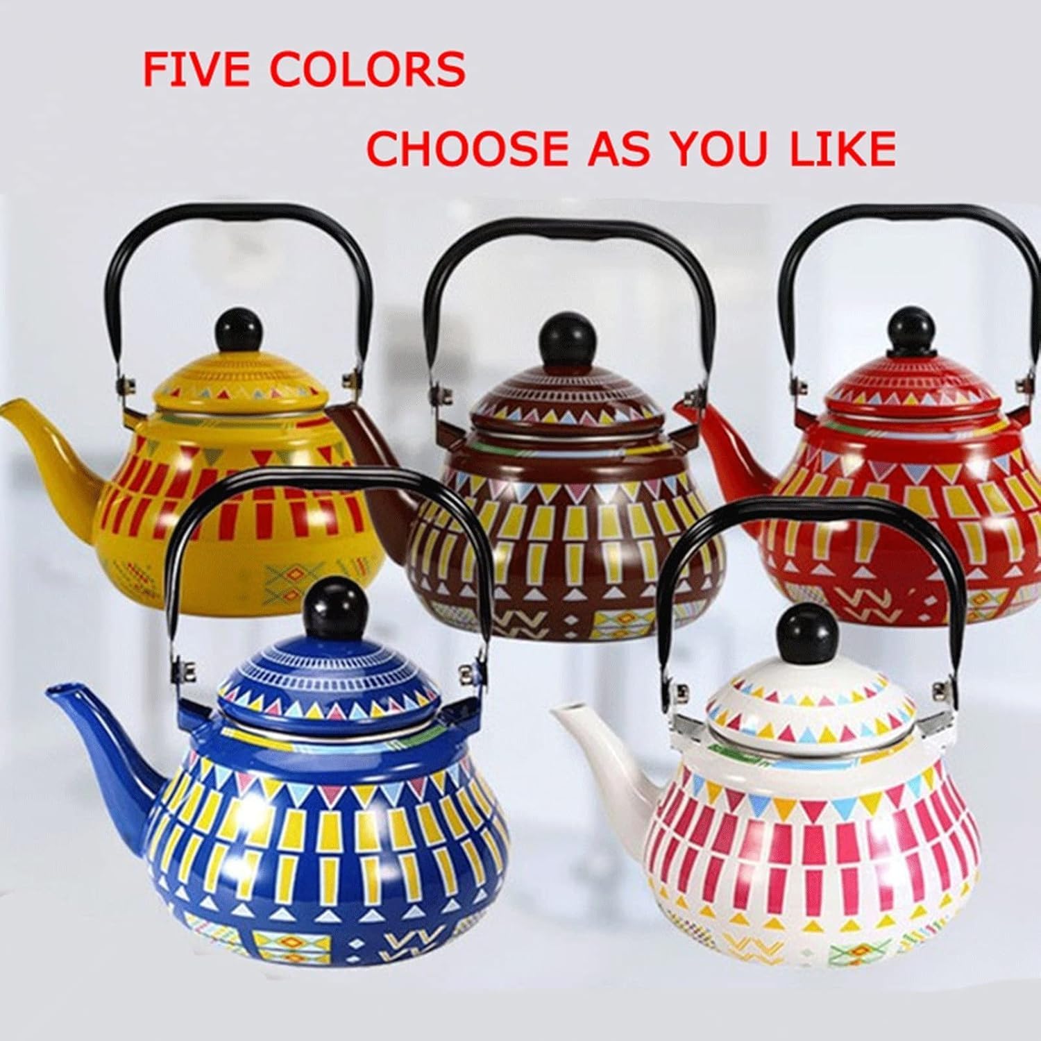 PRODUCT SPECIFICATIONS:Name: Tea KettleMaterial: EnamelColor: Red , Blue , White , Yellow , BrownCapacity: 1.5L, 2L, 2.5L.Size:1.5 Liters: Mouth Diameter: 3.54 inches; Teapot Height: 3.74 inches; Overall Height: 7.87 inches; Bottom Diameter: 4.33 inches.2.0 Liters: Mouth Diameter: 3.74 inches; Teapot Height: 4.52 inches; Overall Height: 8.85 inches; Bottom Diameter: 4.72 inches.2.5 Liters: Mouth Diameter: 4.13 inches; Teapot Height: 4.92 inches; Overall Height: 9.84 inches; Bottom Diameter: 5.51 inches.Due to manual measurement, the actual size and data of the product will be slightly different, please refer to the actual product!Due to the shooting environment and lighting effects, there may be a little color difference, please understand!