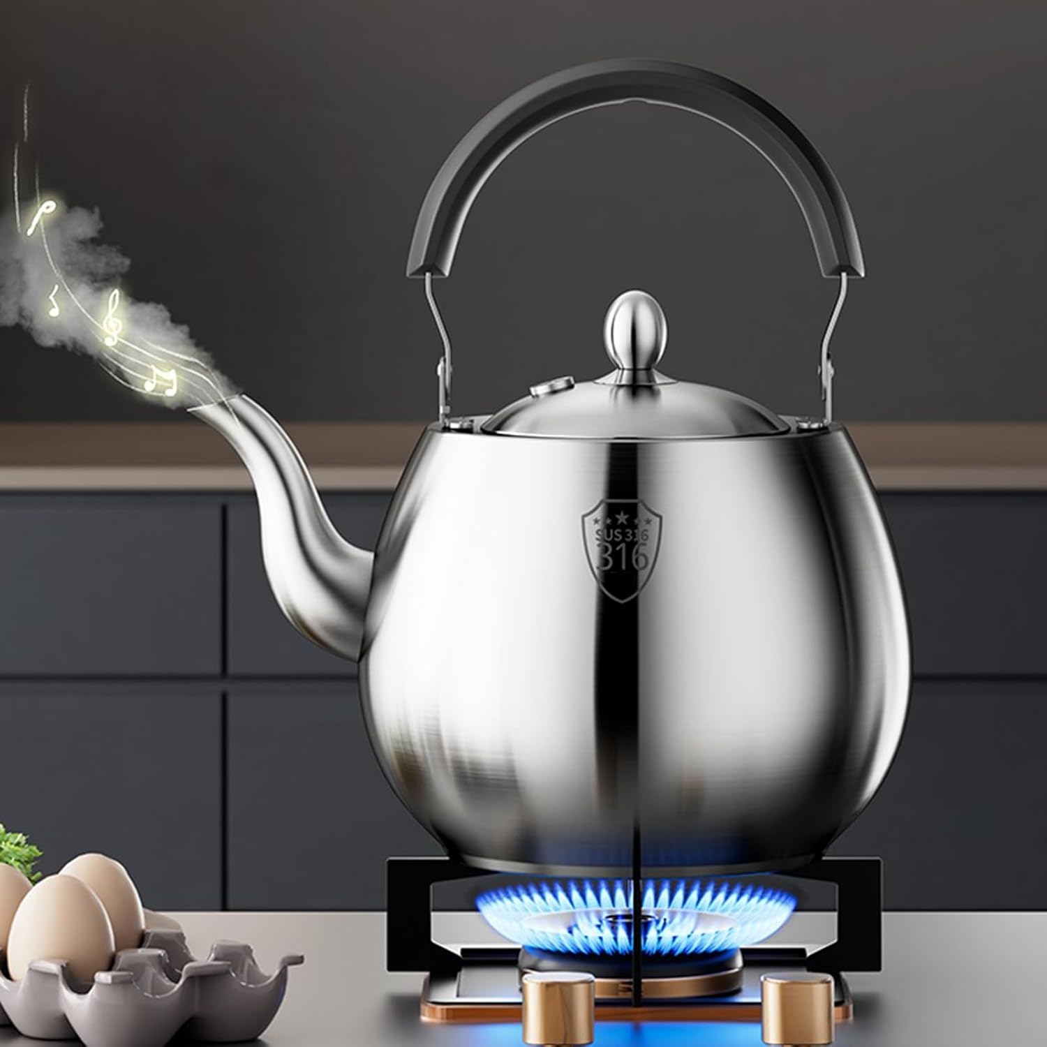 Product descriptionStainless steel whistle teapot, high temperature resistance, strong and durable, large diameter, easy to fill and clean, household stove teapot.FeaturesThe streamlined spout ensures smooth water quality and avoids splashes and burns when pouring water.Bright and easy to clean, the pot adopts electrolysis technology, the surface is clean and easy to clean, not easy to scale.Thickening and widening, uniform heating, fast heat conduction, suitable for various stoves.SpecificationMaterial: 316 Stainless steelColor: SilverCapacity: 4/5/6 liters