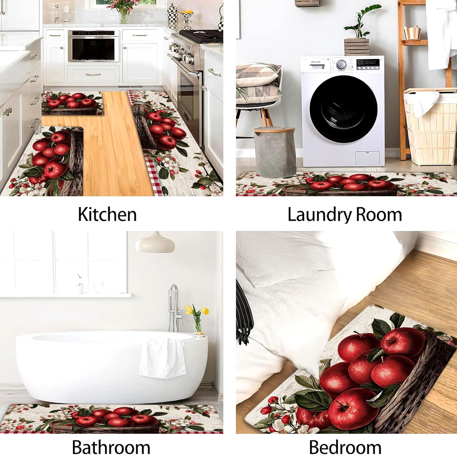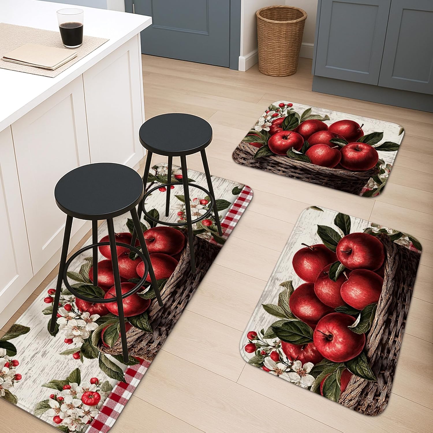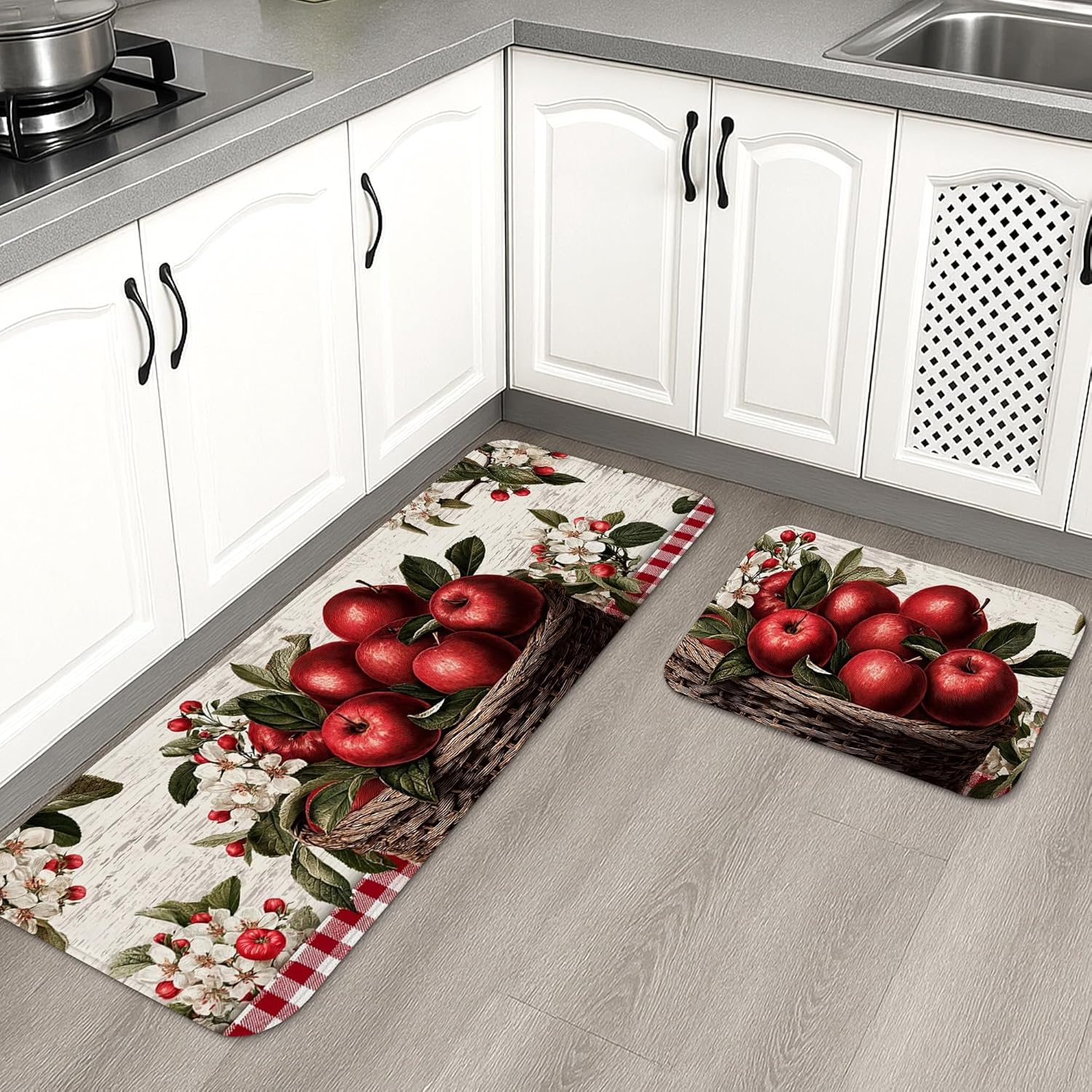 Vintage Rustic Kitchen Mats for Floor, Red Apples Floral Soft Mats, Cushioned Comfort Washable Non Slip Decor Rugs For Kitchen Sinks Laundry Room Bathroom