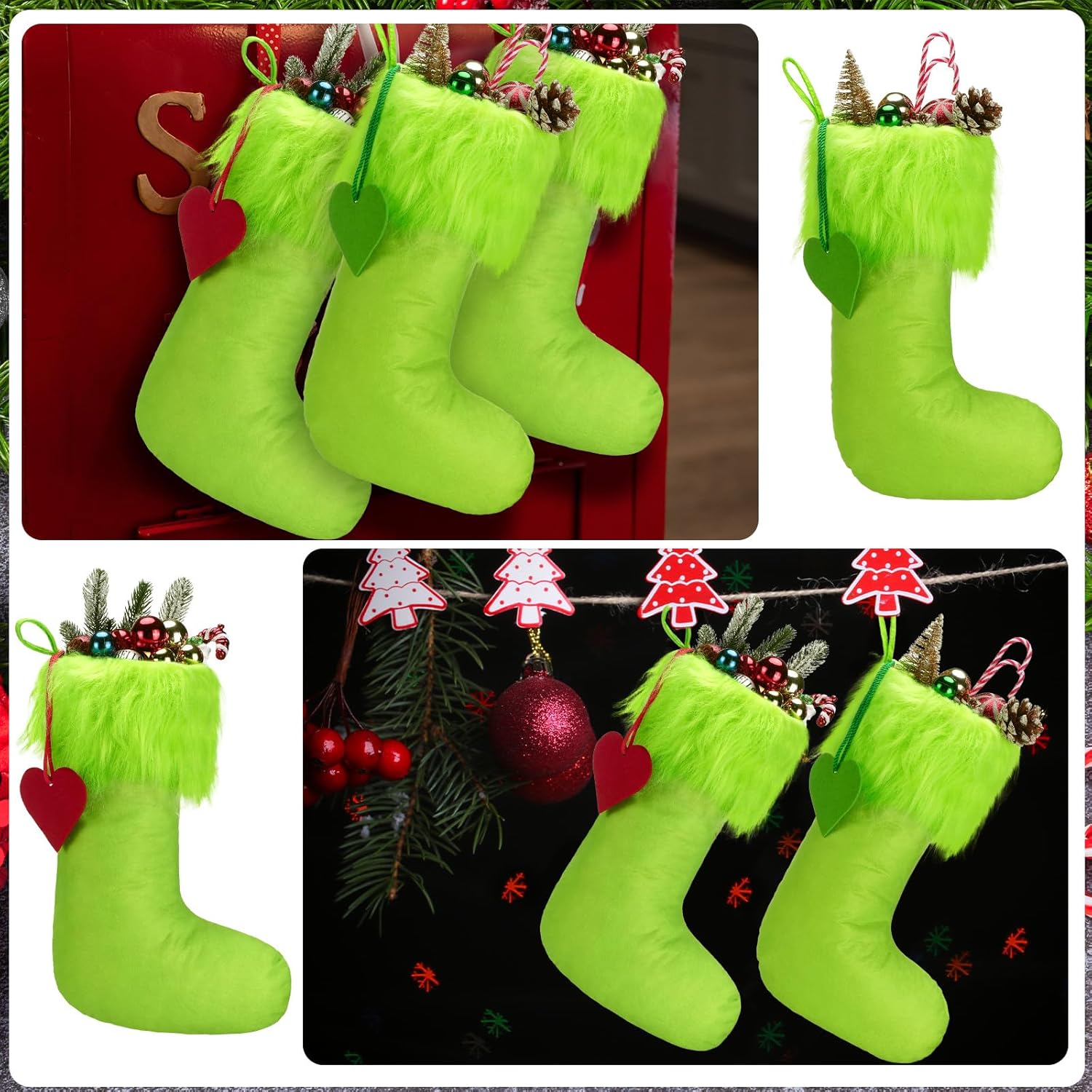 Features: Give more than just a stocking, give a treasured memento. These large Xmas stockings help create unforgettable memories and convey your love and care. Seal your holiday season with joy, love, and beautifully designed stockings, sure to be cherished year after year. Designed with a special artificial green fur, these Christmas stockings for family not only serve as decoration but also as bearers of gifts and sweet surprises for your loved ones. Specifications: Material: main polyester, acrylic (artificial fur), cotton, linen, feltColor: green Size: about 18'' HPackage includes: 8 x Christmas stockings Notes: Manual measurement, please allow slight errors on size. The color may exist a slight difference due to different screen displays.