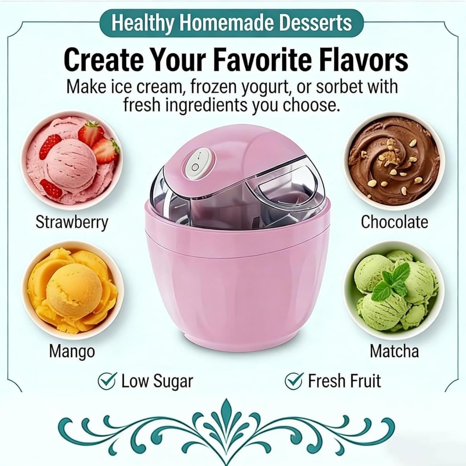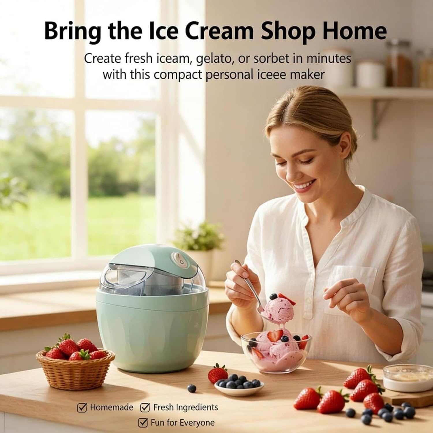 Small Home Mini Ice Cream Maker, Electric Personal Gelato & Sorbet Machine, DIY Makes Single Serving of Gelato, Frozen Yogurt, Easy One-Touch Dessert Maker for FamiliesFeatures:1.Homemade ice cream in just 15 minutes.2.Control sugar & calorie levels as you like.3.Great fun for parents and children.4.Compact design saves space.5.Fast freezing and easy cleanup.Specifications:Name: Small Home Mini Ice Cream MakerColor: Pink, GreenWeight: Approx. 1.2kgDimensions: 5.5*5.5 *6.5inPackage Include:1PC * Small Home Mini Ice Cream MakerNote:1.There may be slight differences in dimensions due to manual measurements. We kindly ask for your understanding regarding this2.The actual color of the product may appear slightly different from the images due to variations in monitor settings and lighting conditions. We appreciate your understanding.Q&A:Q1: How long does it take to make ice cream?A1: With proper pre-freezing of the bowl, this mini ice cream maker can make frozen desserts in about 15–20 minutes.Q2: What desserts can I make with it?A2: It works great for making ice cream, gelato, sorbet, frozen yogurt, fruit-based treats and dairy-free frozen desserts.Q3: Can I add fruit or chocolate chips?A3: Yes. You can add fruits, nuts, chocolate chips and other mix-ins to create your favorite flavors.Q4: Is this ice cream maker easy to clean?A4: Yes. The detachable parts are easy to rinse and clean, making daily maintenance simple and convenient.