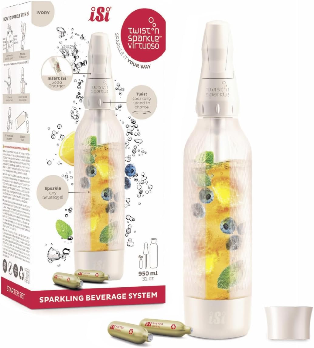 Twist'n Sparkle Virtuoso – Sparkle It Your Way! Whether it's water, cocktails, or juices: With the Twist'n Sparkle Virtuoso, you can fizz everything you love, right in the bottle. Simply fill the bottle with your favorite ingredients, insert the iSi soda cartridge, and twist shut – and in seconds, your favorite drink will be sparkling. The patented "iSi CO2 Infusion Technology" ensures perfect fizz – right in the bottle. Pro tip: The colder the drink, the fizzyer it becomes. The optimal fizz is achieved at around 6 degrees Celsius. An additional bottle is ideal for pre-chilling drinks. As flexible as your life – and as compact as you need it. Thanks to its slim design, the Twist'n Sparkle Virtuoso fits in any kitchen or backpack. Ideal for everyday use, on the go, or special moments with friends. Instead of disposable bottles and ready-to-drink beverages, you decide what goes into your glass – fresh, sparkling, and with maximum freedom.
