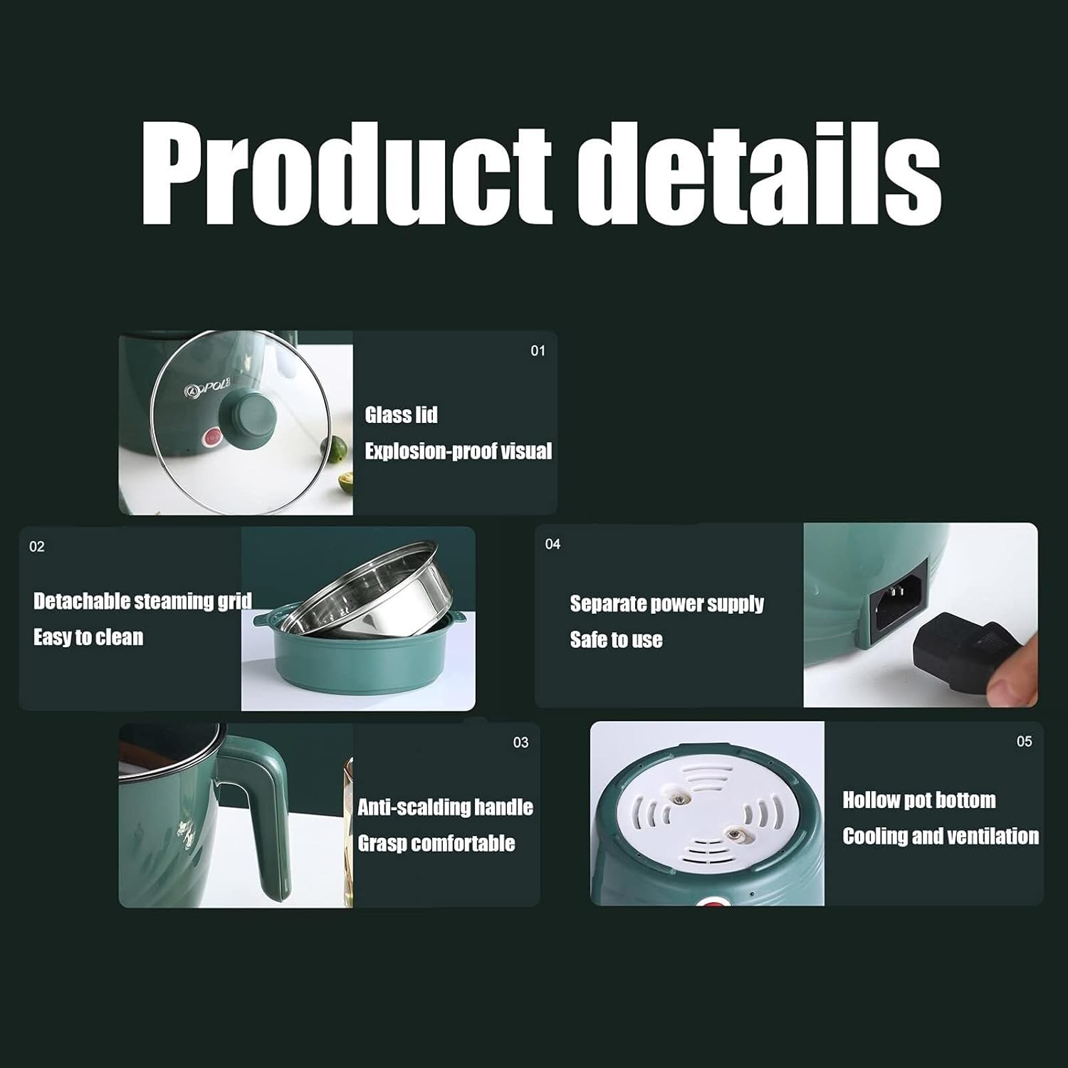 Specification:Rated voltage: 220VRated power: 300W~600WRated capacity: 1.8LSteam grid height: 5.5CMBottom pot height: 13CMPot mouth diameter: 16CMWhole pot height: 20CM