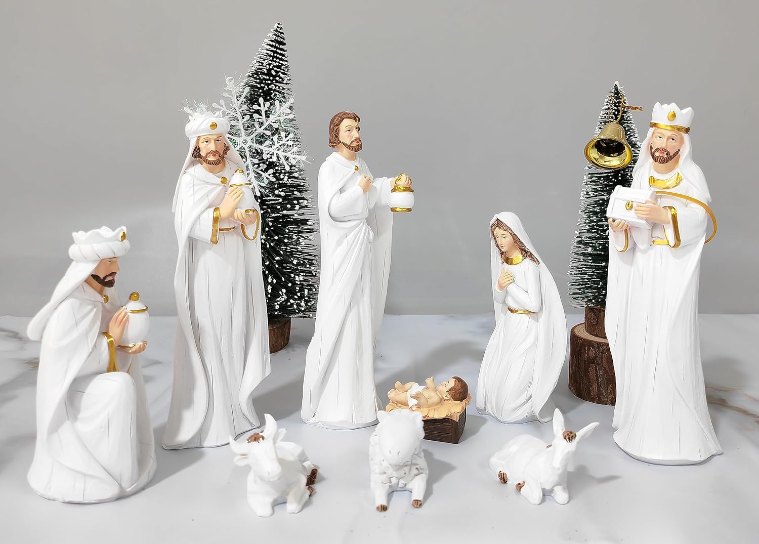 Celebrate the true spirit of Christmas with this 9-Piece White Nativity Set, a graceful and meaningful centerpiece for your holiday decor. This elegant set includes all the key figures of the Nativity story—Mary, Joseph, Baby Jesus, the Three Wise Men, a shepherd, and animals—all hand-painted in soft white tones with golden highlights.br> Crafted from durable resin, each figurine showcases gentle expressions and flowing robes, designed to bring peace and reverence to your seasonal display. The modern minimalist palette ensures it fits beautifully in both traditional and contemporary homes.br> Whether you place it on a mantel, dining table, shelf, or under the Christmas tree, this nativity set adds a sacred, heartwarming touch to your festivities. It also makes a cherished gift for Christian families or anyone who values faith-based holiday traditions.