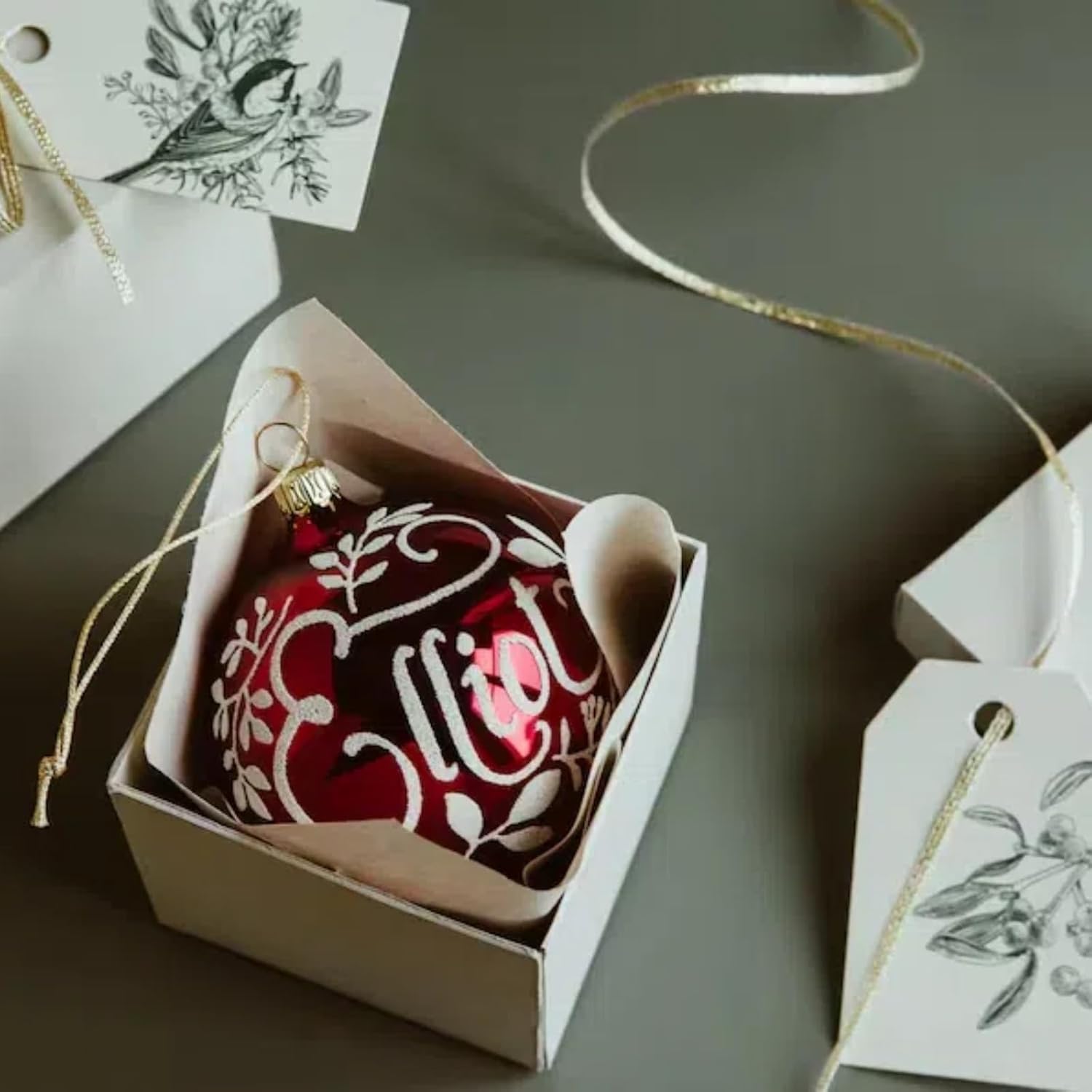 Personalize your Christmas tree with these vintage-inspired glass ornaments. Available in 8 and 10 cm diameters, each bauble can be customized with a name or word of your choice, adding a sentimental touch to your holiday decor. The ornaments feature beautiful calligraphic designs in festive red, green, and gold hues, reminiscent of a bygone era. Hang them on your tree or use them as decorative accents around the home. These personalized ornaments make thoughtful gifts for loved ones, allowing you to create cherished keepsakes. With their timeless appeal, they'll become treasured additions to your Christmas celebrations for years to come.