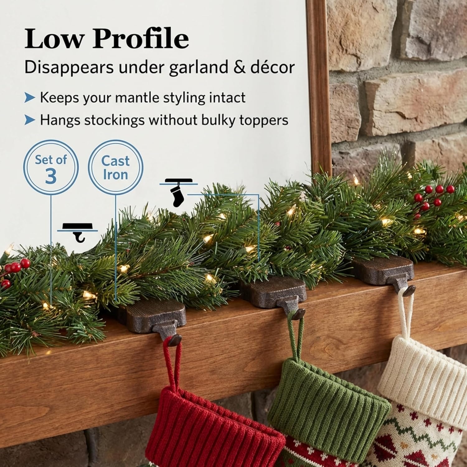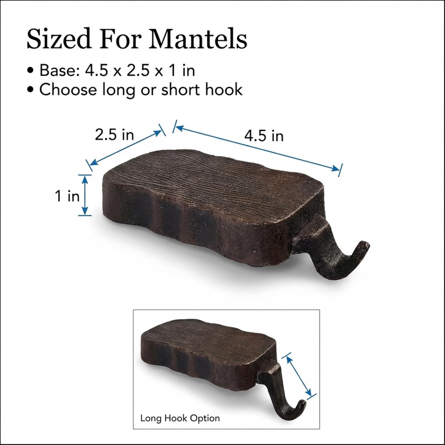 Sturdy & heavy duty 100% Cast Iron log design stocking hooks with thick rubber padded base for perfect grip & no scratches on your furniture. Exclusively designed & made by Lulu Decor. Each Christmas Stocking hook weighs 2.2 lbs & measures 2.50" x 4.50". Sold in set of 2 hooks, total weight 4.40 lbs, comes with both long and short hooks, which you can use according to your mantel design. Customize your stocking holder top and create something new for the occasion. Create something new every year. Best for creative minds. It can also be used as is without top. It is heavy enough to hold your stockings.