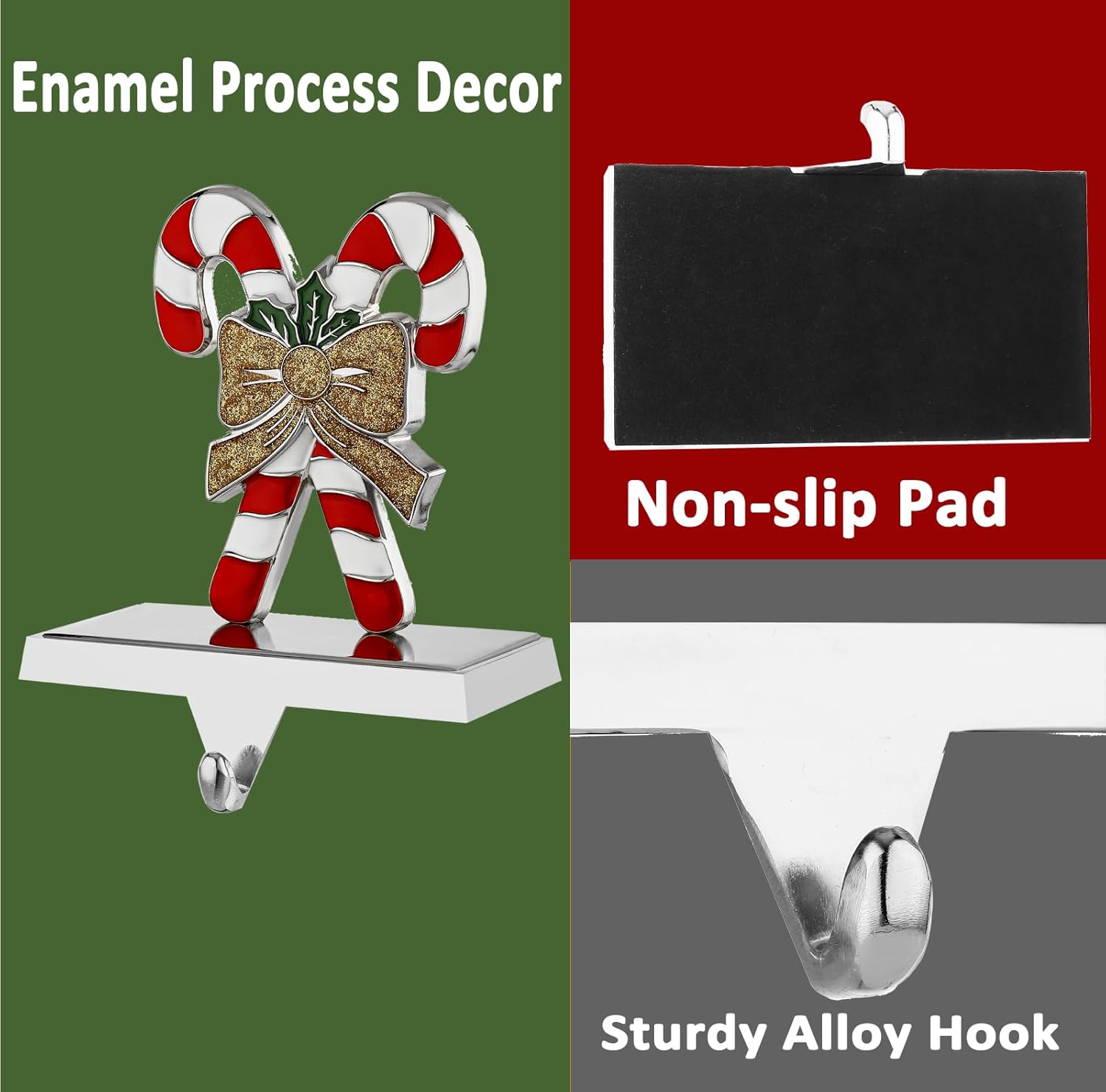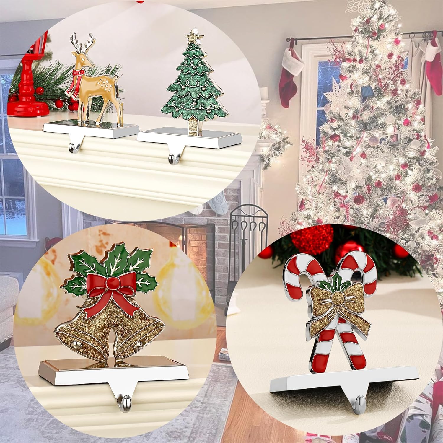 Dimension: 5 * 2.7 * 7 incn Color: Multicolor Style:Christmas Decor Package Include: 5 pieces Christmas stocking holders for mantle 1 piece tree Chrismas Stocking Holders for Mantel/Fireplace 1 piece deer stocking holder 1 piece Christmas snowflake stocking holder1 piece Christmas bell stocking holder for fireplace 1 pcs candy cane stocking holder Good quality, fun designs, and useful products to bring on that holiday spirit! Heavy enough to stay on the mantle even when it's loaded with Santa's gifts. Stocking Holders is the perfect functional + decorative accent for your home. Set these cute hangers up on your mantle or bookshelf and feel the holiday rhythm streaming in your home. With its heavy base, these stocking holders are able to sit on your mantle and comes with the hook for hanging your stockings They can be displayed in your kitchen, fireplace, or anywhere in your home! EXCELLENT DETAILS: This Decorative Christmas Reindeer and Sleigh Stocking Holder is designed not only to make your place stylish, but its perfect size makes this item good to display on mantel top or by a shelf SEASONAL CHARM: This seasonal item is made of sturdy materials that makes this item reusable and gives it a classy Holiday look