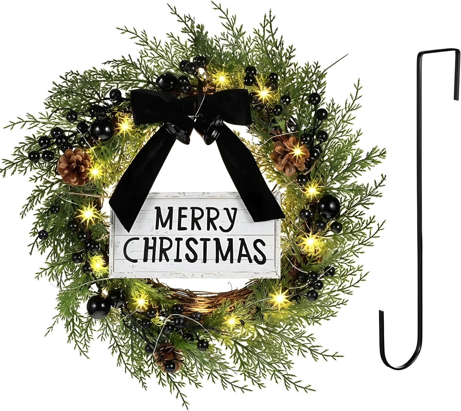 Features: Thoughtful Gift Option: This outdoor Christmas wreath serves not only as a stunning decoration but also as a warm and thoughtful gift. Whether for housewarming parties, holiday gatherings, or simply to spread joy, gifting this wreath is a meaningful way to share the festive spirit with loved ones, making it a cherished addition to their holiday decor. Great for Photos: This Christmas wreath makes an ideal backdrop for holiday photos. Its vibrant colors and festive elements create a beautiful setting for family pictures, holiday cards, or social media posts, capturing the joy of the season Specifications: Material: PE and silk Color: multicolor Size: Christmas wreaths: outer diameter about 20 inches Light string: about 9.84 ft/ 3 meter Package includes: 1 x Christmas wreaths 1 x Wreath hangers 1 x Light string Notes: Manual measurement, please allow slight errors on size. The color may exist a slight difference due to different screen displays. Winding risk may exist, please keep our product away from children Warm reminder: For safety and longer life, always fully unfold the bulbs before use. Bundling them can cause overheating and hazards