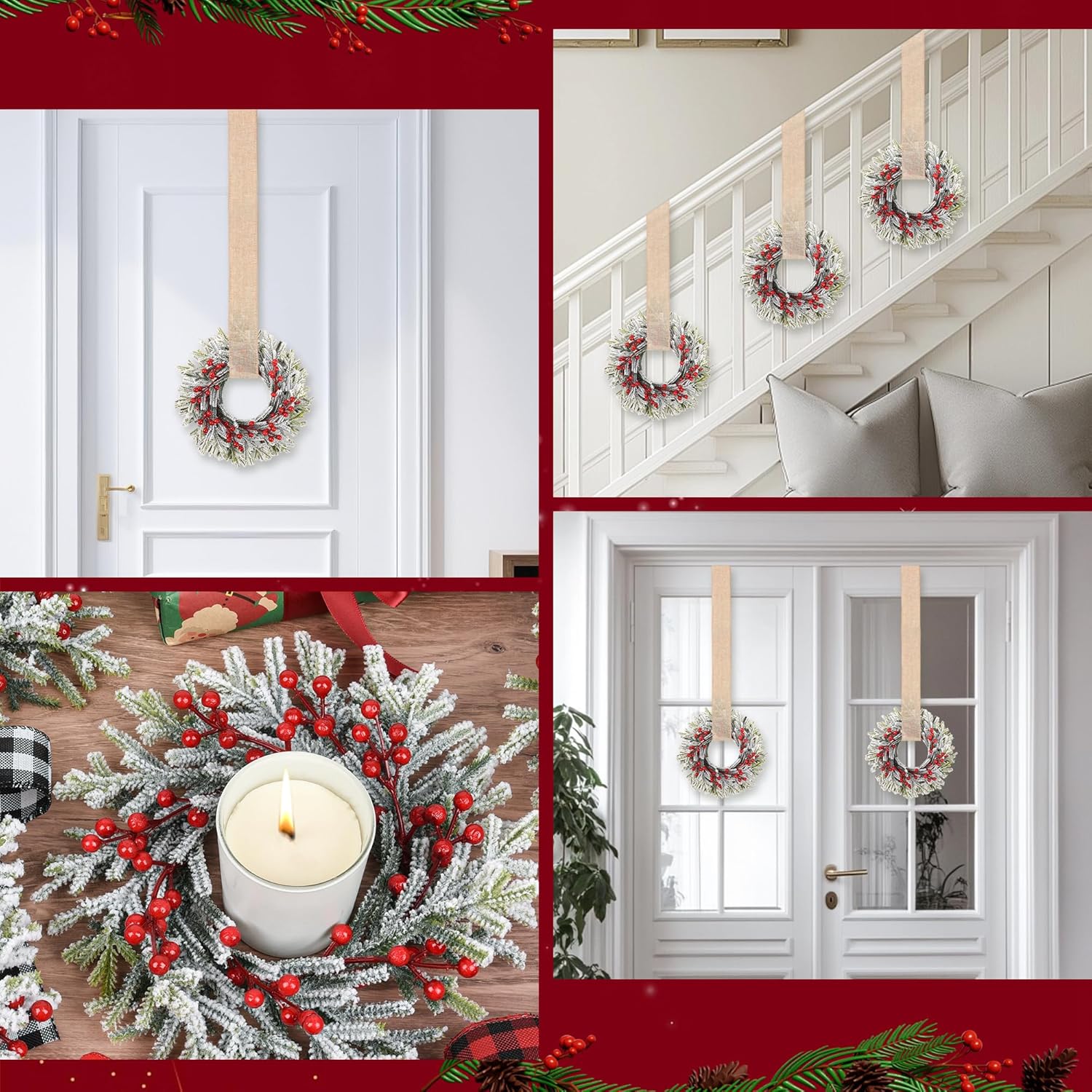 Instant Holiday Decor - Mini Wreaths with Hanging Ribbon Ready to Hang: Each wreath comes with a pre-attached ribbon for instant decorating. Adjustable Long Ribbon for Versatile Use: A 63-inch customizable ribbon fits cabinets, doors, windows, stair railings, and more. Detachable Ribbon: Easily remove the ribbon to turn it into an elegant candle ring. Specifications: Wreath Size: 9.5" (24.13 cm) outer diameter / 3.94" (10 cm) inner diameter Ribbon: 63" (160 cm) long × 1.57" (4 cm) wide Color: As pictured Material: Artificial pine, metal wire, faux berries, ribbon Package Includes: 12 × small Christmas wreaths with adjustable & detachable ribbons Note: Keep away from open flames. Not fireproof.