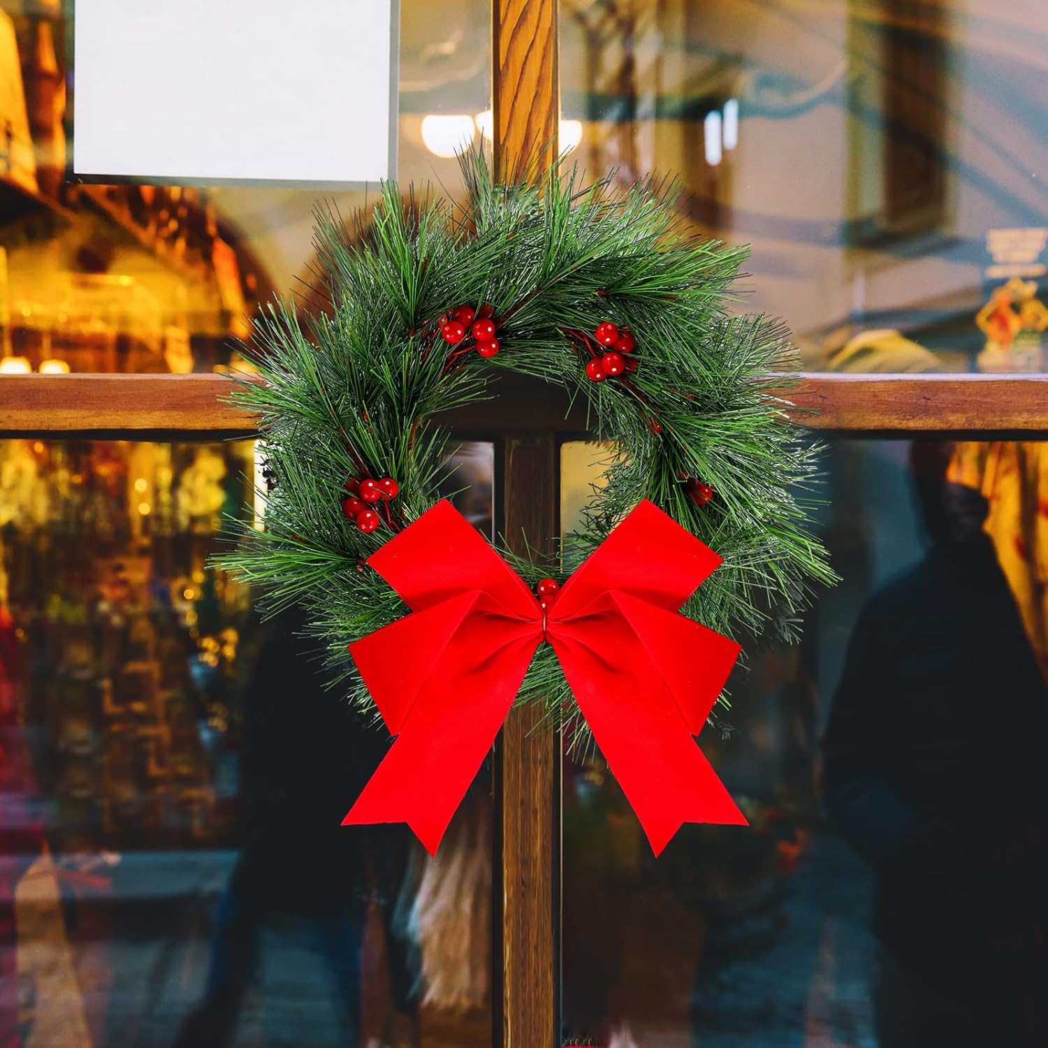 Features: Considering the simple and stylish designs, bright and vibrant colors, the artificial faux fir leaves wreaths are easy for you to match well with various styles of occasions. Also they can keep harmonious with house styles, which can bring refreshing feelings. The decorative hanging wreaths for cabinet will give warm color to your home and leave your guests with precious memory, creating a celebratory atmosphere and giving you beautiful visual effects to in line with your home and party. Specifications: Main material: plastic and polyester Main color: red, green Wreath size: approx. 5 inches/ 13 cm in inner diameter Bow size: approx. 7 x 5.5 inches/ 18 x 14 cm Ribbon size: approx. 2.5 inches/ 6.3 cm in width Package includes: 6 x Christmas faux kitchen cabinet wreaths with bows Notes: Manual measurement, please allow slight errors on size. The color may exist a slight difference due to different screen displays. Winding risk may exist, please keep our product away from children.