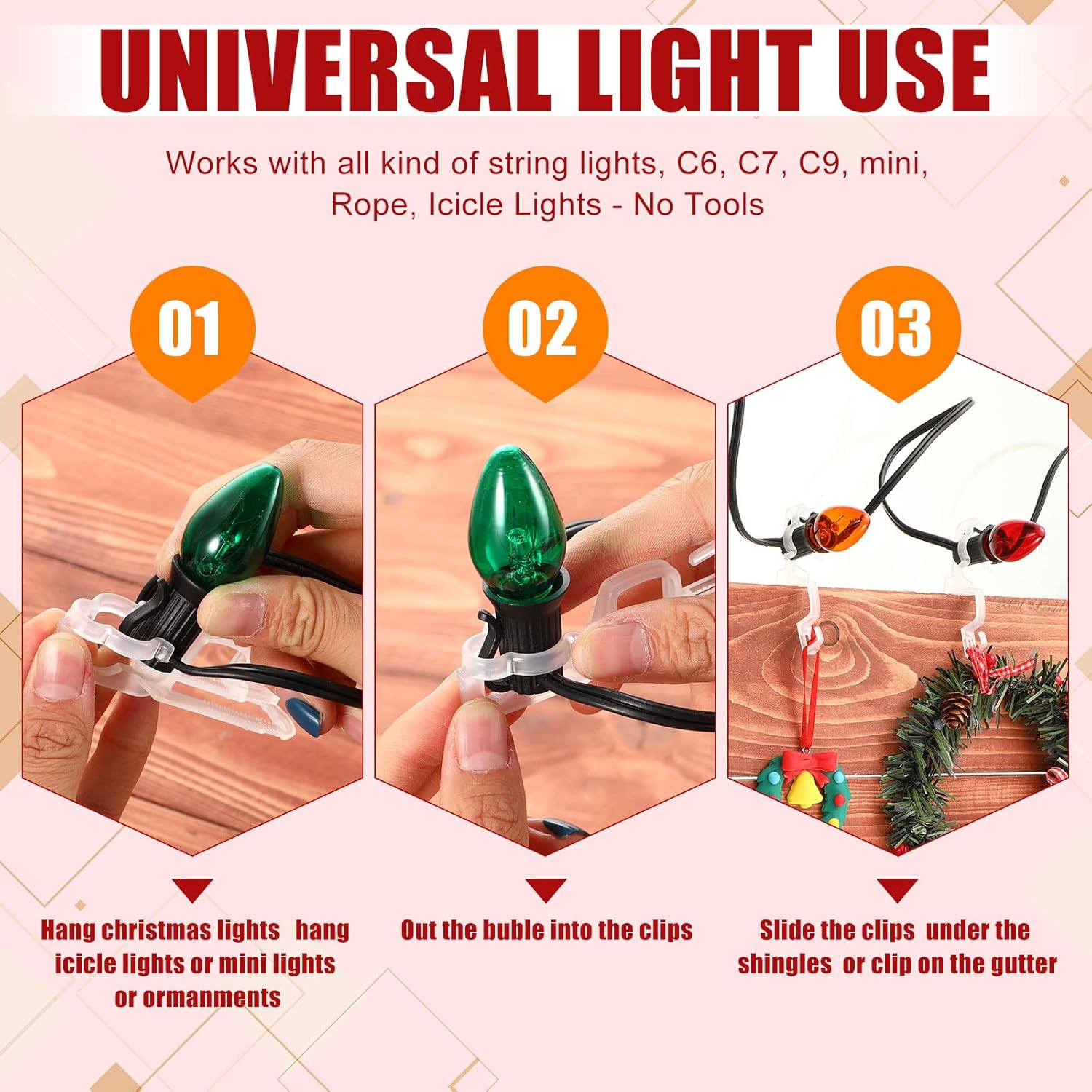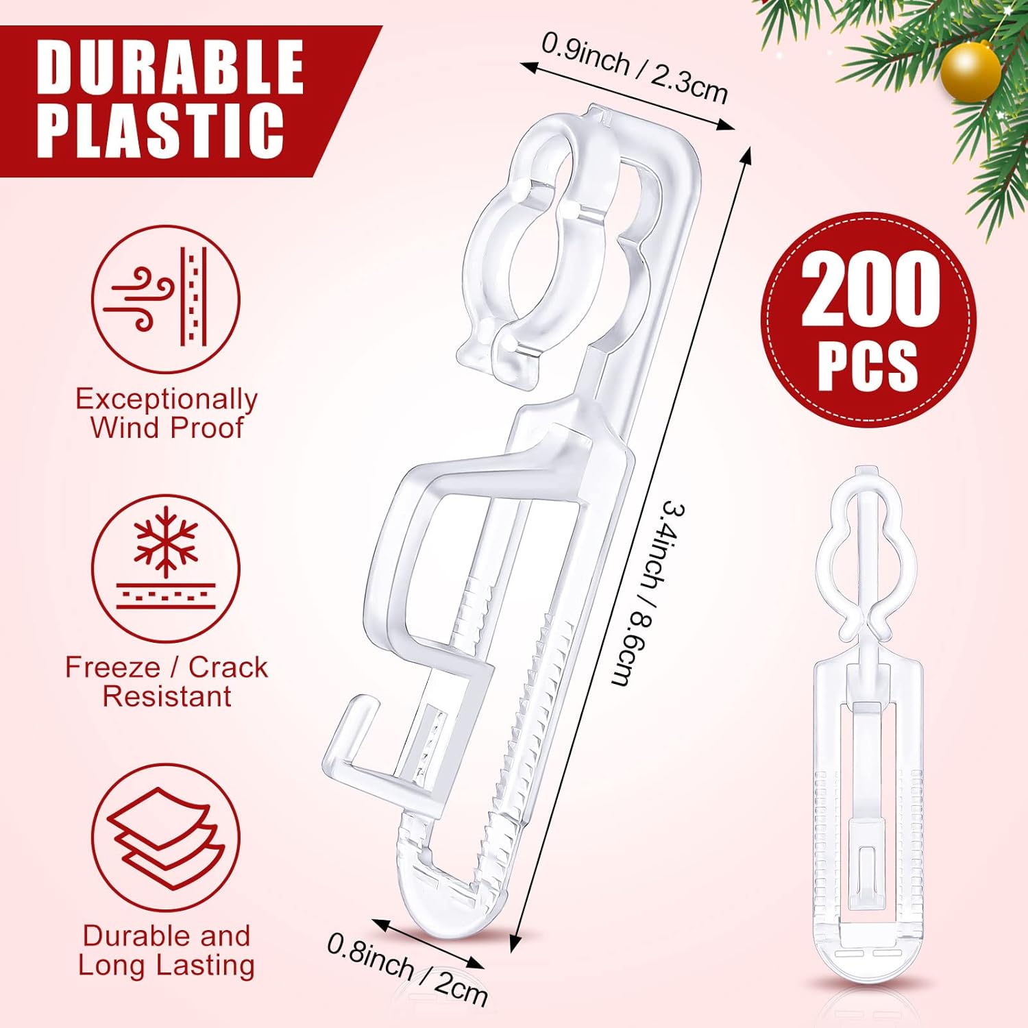 Features:Widely applied:Outdoor Christmas lights clips are ideal for fixed decorations of Christmas and holidays lighting, making string lights neat and orderly, full of festive atmosphere, and they are also suitable for Halloween, New Year, birthday, wedding and other party lighting decorations.Nice to share:You can send Christmas light hangers as gifts for your family, friends, colleagues, neighbors, relatives, teachers, classmates or others you care about, helping them easily assemble their Christmas lights, showing your care and love, also to enhance your relationship.Specifications:Material: plasticColor: translucentSize: approx. 8.5 x 1.9 cm/ 3.35 x 0.75 inch in length and widthPackage includes:200 x Christmas light clipsNotes:Manual measurement, please allow slight errors on size.The color may exist a slight difference due to different screen displays.