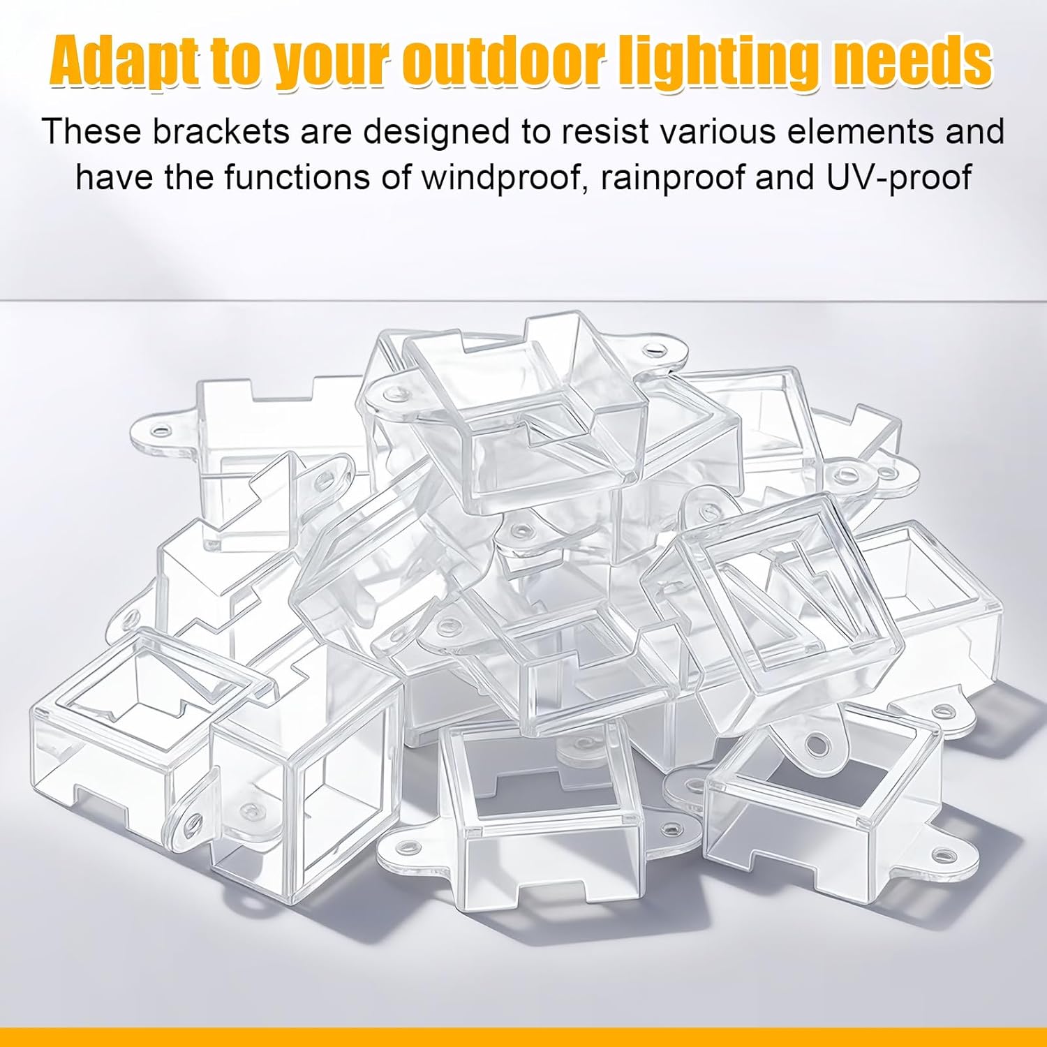 Features: The clips are designed with a low-profile form factor that prioritizes a discreet visual presence once the installation is complete. Their design focus allows the lighting fixtures themselves to be the highlight, with the mounting hardware blending inconspicuously into the background. Designed to withstand the elements, these mounting brackets are wind-proof, rainproof, and UV protected. They provide reliable application throughout changing weather conditions, ensuring a long service life Specifications: Material: plastic Color: clear Size: about 2.36 x 1.38 x 0.79 inches/ 6 x 3.5 x 2 cm Package includes: 108 x Bracket Notes: Manual measurement, please allow slight errors on size. The color may exist a slight difference due to different screen displays