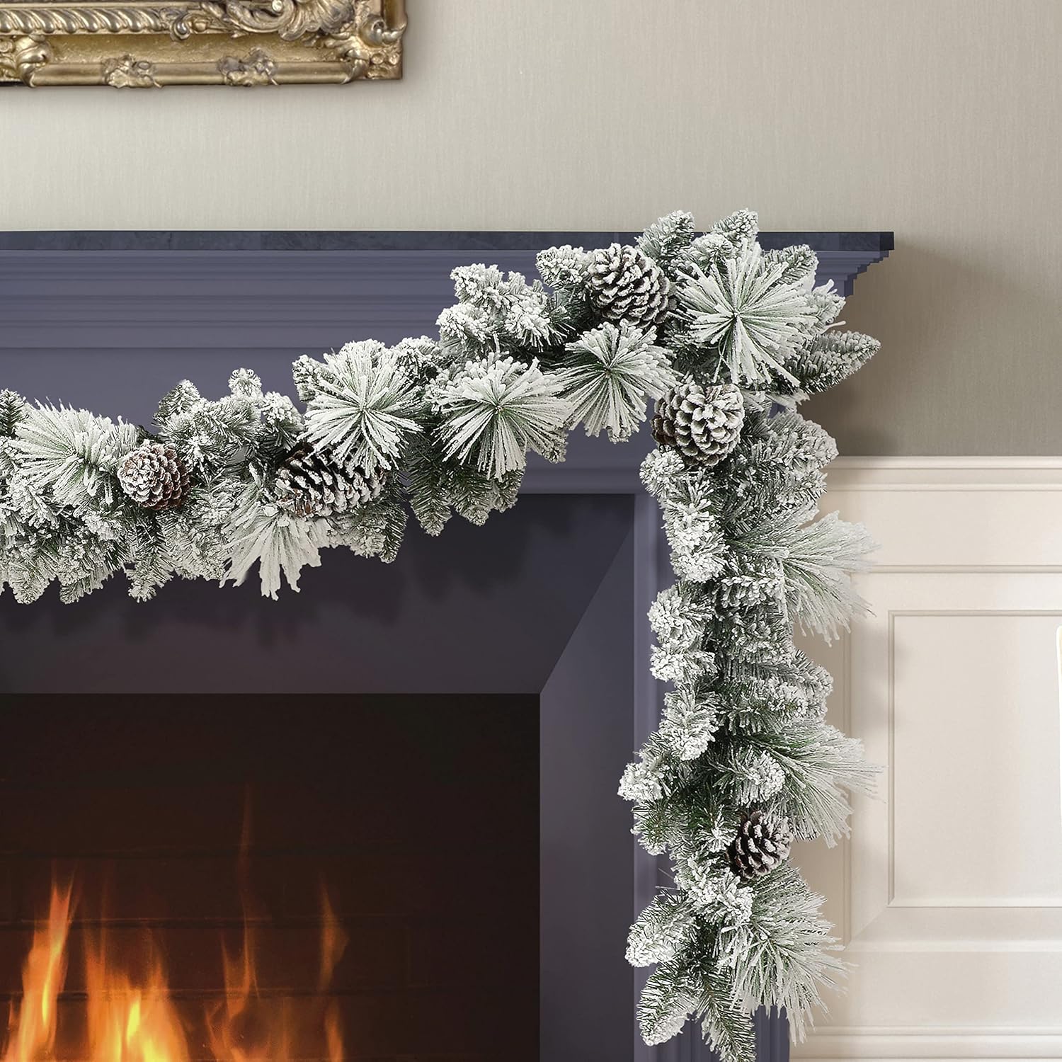 Get into the holiday spirit with the Puleo International Flocked Berkshire Spruce Christmas Garland. This 9-foot long artificial holiday garland with elegant snow-dusted pine needles, a dash of silver glitter, and realistic pine cones perfectly captures the ambiance of the wintry forests in your home. This garland offers a 10-inch wide full appearance, with 170 PE/PVC branch tips that stimulate a realistic feel of nature's beauty. Suitable for either indoor or covered outdoor display, this versatile garland can be hung, draped, or wrapped on your banisters, atop the fireplace mantle, or wound along your covered porch's guardrail or support columns. Assembly is quick and easy- simply take the garland out of the box, adjust the branches, and begin decorating right away. The hypoallergenic and needle-shed resistant garland offers a safer alternative to fresh-cut Christmas greenery, so you can welcome in friends and family for holiday celebrations without worry. This product is backed by a five-year warranty for years of quality use.
