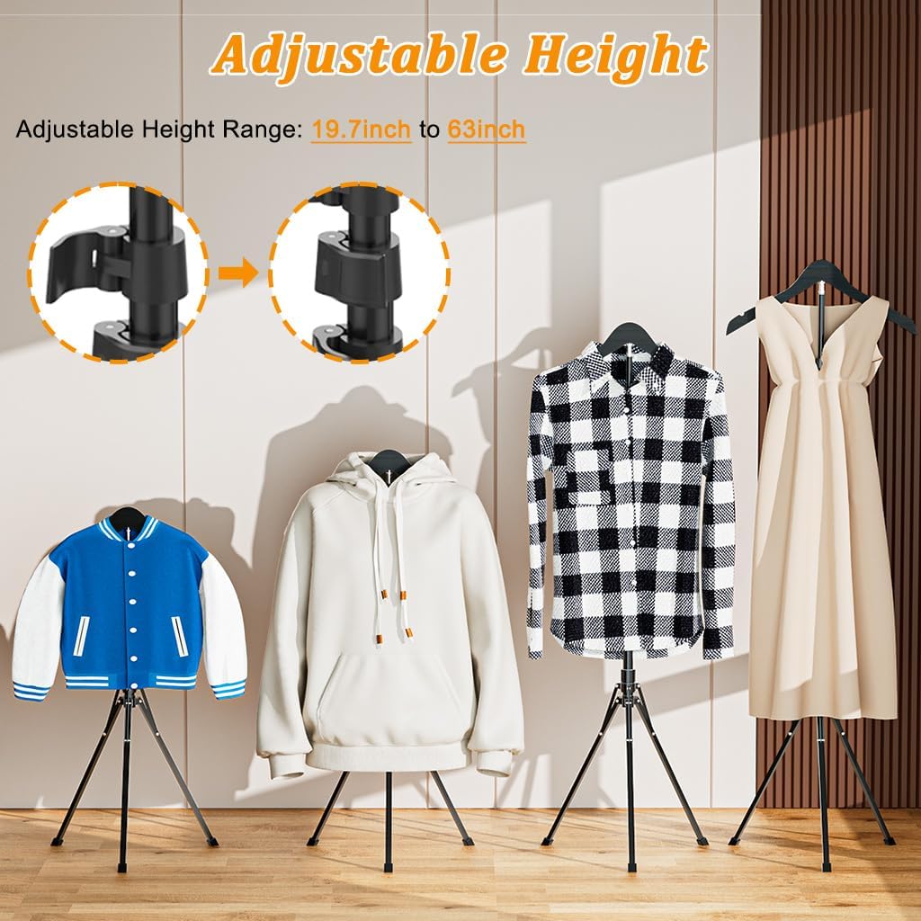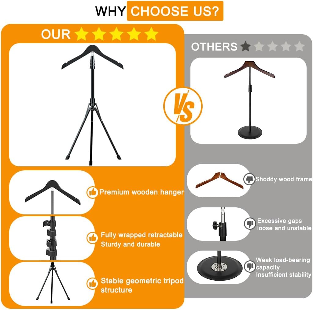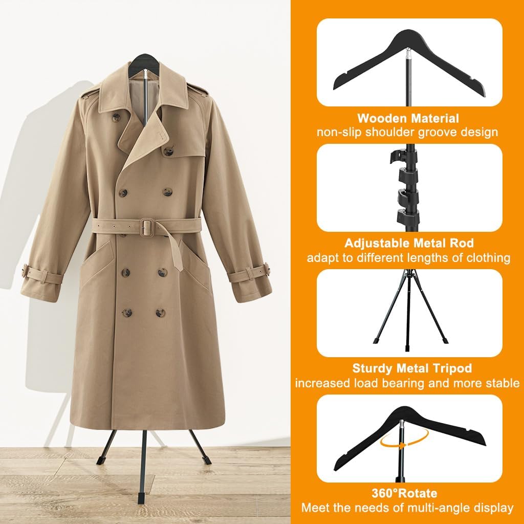 Foldable and Height-Adjustable T Shirt Display StandAre you tired of those bulky, unstable clothing rack that always drag your favorite coats on the floor?Want to instantly elevate your clothing display while saving space?This clothing display stand perfectly combines the smooth texture of a solid wood hanger with the sturdiness and durability of a metal tripod, making it ideal for retail vendors, pop-up stalls, or home use.Features:Super Stable Triangular Structure: We've abandoned the wobbly instability of traditional quadrupeds and the weak load-bearing capacity of round bases, innovatively adopting a weighted triangular base. The triangular structure can evenly distribute weight and effectively resist tipping caused by external forces such as customer touch or wind.Adjustable Height: The flexible telescopic structure allows the height to be freely adjusted between 20 and 63 inches. Whether it's a cropped T-shirt or a floor-length skirt, it matches perfectly, completely solving the awkwardness of mismatched display rack heights.360° Rotating Display: The wooden hanger at the top rotates smoothly, allowing customers to appreciate the cut and details of the garments from all angles, making it extremely convenient whether browsing in-store or trying on at home.Folding & Portable: When not in use, it easily folds to a compact size of only 16 inches, easily stored in a closet, under a counter, or even in a travel backpack. For market vendors, pop-up shop owners, or renters who need to move frequently, this is undoubtedly the dream display tool.Versatile Use: T shirt display stand not only a professional display tool for retail stores and trade shows, but it can also be used for art exhibitions and graduation party displays. At home, it's also a practical coat rack or Steamer Rack Stand, meeting your diverse needs.Find a mobile home for your clothing, bring this elegance and sturdiness home today!