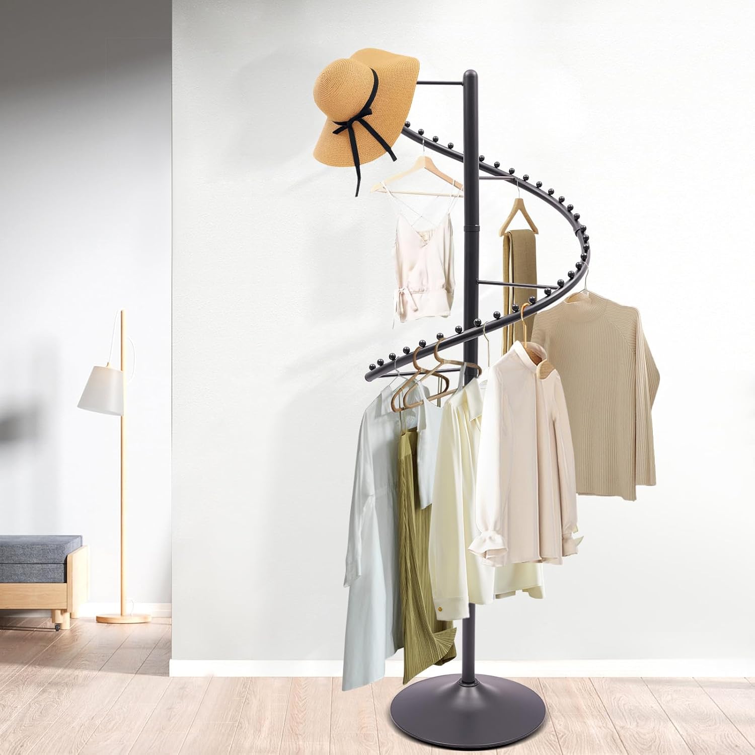 ApplicationThis spiral retail garment rack can be installed in bedrooms and laundry rooms to hang items such as hats, scarves, bags and clothes. It can also be installed in a boutique or showroom to be used as a commercial-grade drying rack.SpecificationMaterial: IronColor: BlackProcess: Painting, WeldingStyle: ModernAssembly Required: YesRotation Angle: 360°Mounting Type: Floor StandProduct Height: 1.8m/5.91ftBase Diameter: 45cm/17.72inPackage Size: 77*33*36cm/30.31*12.99*14.17inGross Weight: 9kg/19.84lbsNet Weight: 8.5kg/18.74lbsEach Package Included1* Rotating Clothing RackOther Accessories for Assembly
