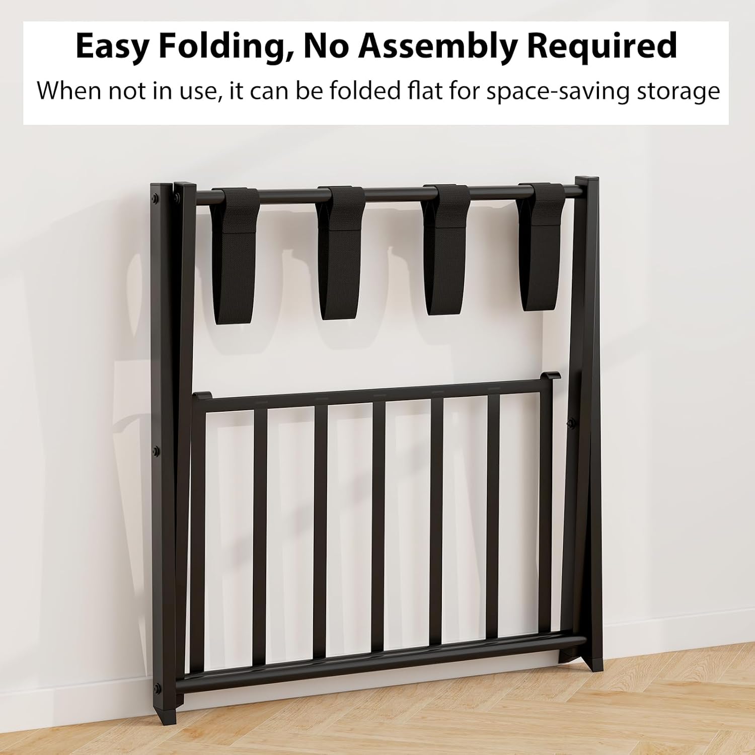 DescriptionSave your back with this luggage holder!The luggage rack keeps your suitcase off the floor and prevents you from bending over to get it! The upgraded strong nylon straps ensure high load capacity, so that the suitcase can stably perch on. With bottom slatted shelf, you can conveniently place your shoes or travel necessities. Better still, the bottom shelf can be removed as needed. Made of heavy-duty metal frame with non-slip foot pads, the luggage rack is given enhanced stability, which won’t shake during use. When not using it, you can fold it down for space-saving storage.FeatureSolution for packing or unpacking without bending overAnti-wear nylon straps ensure long-lasting service lifeBottom slatted shelf offers extra storage space for shoesYou can remove or attach the bottom shelf as neededMetal frame with X-shaped structure for strong supportProtective foot pads add stability and protect the floorNo assembly required. Easy to set it up or fold it downSturdy enough to hold a 22", 24" or 26" suitcaseSpecificationColor: White + Black/BlackMaterial: Metal, NylonOverall Dimensions: 27" x 18" x 22.5" (L x W x H)Folding Dimensions: 27" x 3" x 27.5" (L x W x H)Weight Capacity of Top: 44 lbsWeight Capacity of Bottom: 66 lbsNet Weight of Each Rack: 9.5 lbsNet Weight of 2 Racks: 19 lbsPackage Includes:1/2 x Luggage Rack1 x User’s Manual