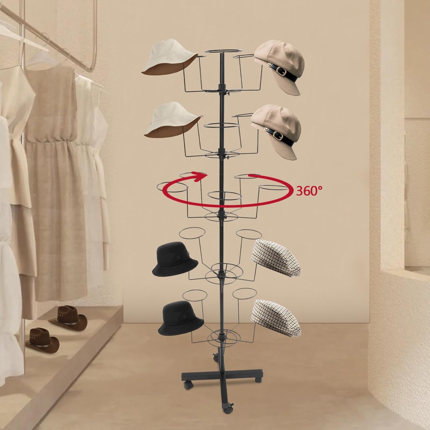 DetailsSmooth Edges:This will not scratch your hats, bringing you a pleasing user experience.Sturdy Base:The sturdy cross-shaped base enhances the product's stability without easily tipping over.ApplicationThis hat display stand rack is suitable for cloakrooms, bedrooms, retail stores, clothing stores, trade exhibitions, shopping centers, supermarkets, and other places.SpecificationsColor: BlackStyle: ModernMaterial: Iron, PlasticProcess: Spray Molding Mount Type: Free StandingAssembly Required: YesNumber of Tiers: 5Number of Wheels: 4(Two with Brakes)Load-bearing Capacity: About 4kg/8.82lbsDiameter of Each Tier: 56cm/22.05inBase Length: 41.5cm/62.99in Product Overall Height: 160cm/62.99in Package Size: 55*55*20cm/21.56*21.56*7.87inGross Weight: 4.6kg/10.14lbsNet Weight: 4.2kg/9.26lbsPackage Included1* Hat Display StandOther Accessories for AssemblyNotes1. Please check the size carefully before ordering. Hats are not included in this package.2. Due to the high body of the hat stand (62.99 inches), it is recommended to install each tier lower during the initial installation, and make appropriate adjustments after installation is completed.