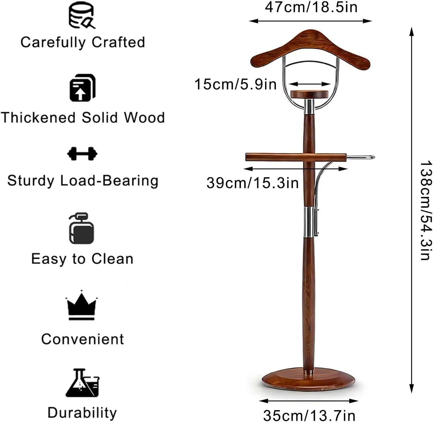Are you still struggling with the clutter of clothing organization?Upgrade your wardrobe organization with our suit valet stand, the valet stand designed specifically for hanging clothes. This elegant suit valet stand not only provides a stylish and functional solution for hanging suits, trousers, and shirts but also adds a touch of sophistication to your bedroom or dressing area.It is not only a suit rack but also a bright landscape in your home space, providing an elegant and practical habitat for your clothes, hats, scarves, and bags, and making your home more neat and orderly.Keeps your wardrobe off the floor, bed, or chair, making your suit look sharp and of wrinkles.ApplicationIt is used in bedrooms, living rooms, hallways, foyers, offices, and small apartments to hang items such as hats, scarves, bags, and clothes.SpecificationName: Suit Valet StandMaterial: Solid WoodAssembly Required: YesPackage1 x Suit Rack1 x InstructionNotesPlease note that items such as suits and trousers are not included in this product.Please allow the slight color difference caused by the shooting light and 1-3 cm error due to manual measurement, and make sure you do not mind before ordering.