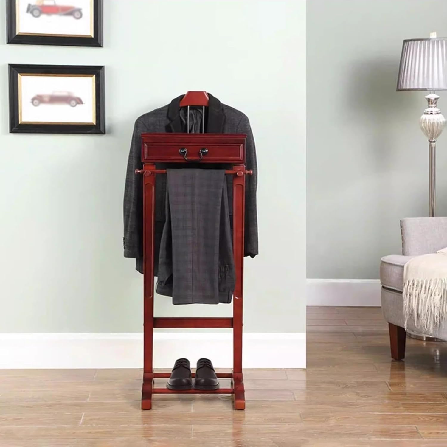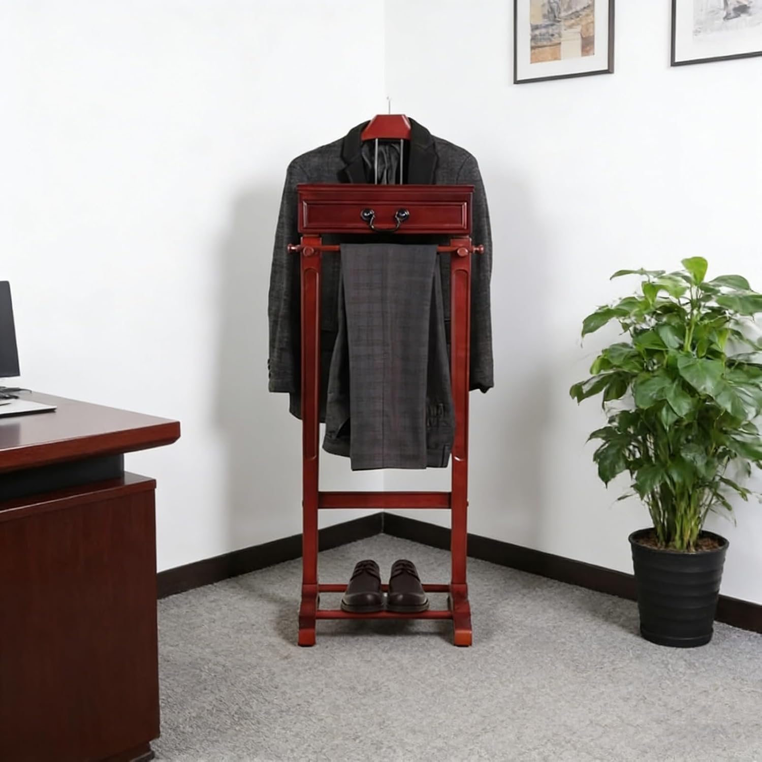 Are you still struggling with the clutter of clothing organization?Upgrade your wardrobe organization with our suit valet stand, the valet stand designed specifically for hanging clothes. This elegant suit valet stand not only provides a stylish and functional solution for hanging suits, trousers, and shirts but also adds a touch of sophistication to your bedroom or dressing area.It is not only a suit rack but also a bright landscape in your home space, providing an elegant and practical habitat for your clothes, hats, scarves, and bags, and making your home more neat and orderly.Keeps your wardrobe off the floor, bed, or chair, making your suit look sharp and of wrinkles.ApplicationIt is used in bedrooms, living rooms, hallways, foyers, offices, and small apartments to hang items such as hats, scarves, bags, and clothes.SpecificationName: Suit Valet StandMaterial: Solid WoodAssembly Required: YesPackage1 x Suit Rack1 x Dusting Brush1 x InstructionNotesPlease note that items such as suits and trousers are not included in this product.Please allow the slight color difference caused by the shooting light and 1-3 cm error due to manual measurement, and make sure you do not mind before ordering.