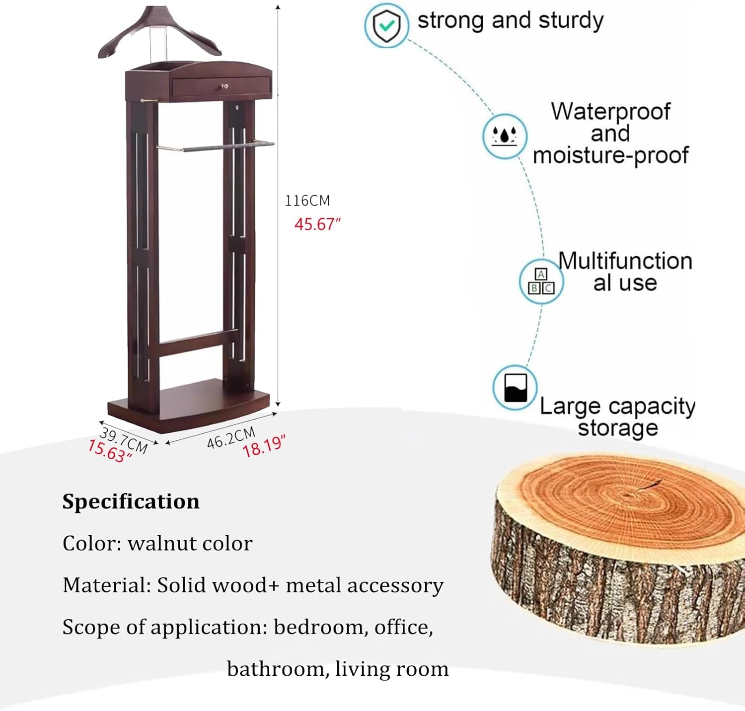 Enhance your space with our Suit Valet Stand, a perfect blend of style and functionality. Crafted from solid wood and featuring elegant metal hardware, this valet stand brings a touch of sophistication to any home or office environment. It's designed to keep your clothing and accessories organized, making it an essential addition to your daily routine.The Suit Valet Stand is your go-to solution for hassle-free mornings. It features a spacious hanger designed specifically for suits and jackets, ensuring they remain wrinkle-free and ready to wear. The integrated trouser bar keeps your pants crease-free, while the accessory tray provides an ideal spot for ties, belts, watches, and other essentials. Say goodbye to clutter and hello to convenience!This versatile valet stand is perfect for various settings, including home entrances, guest rooms, master bedrooms, studio apartments, college dorms, and even hotel rooms. Its timeless design complements any decor, making it a stylish addition to your space.Key Features:Durable solid wood construction, handcrafted for longevityAccessory tray for organizing keys, watches, ties, and beltsWrinkle-free hangers designed specifically for suitsConvenient trouser bar to keep pants perfectly pressedSturdy base for storing shoes securelySpecifications:Color: WalnutMaterial: Solid wood and metalDimensions: 46.2X39.7X116cm (18.19X15.63X45.67 inches)Package Includes:1 x Suit Hanger RackInvest in our Suit Valet Stand today and transform your organization routine while adding a touch of elegance to your space!