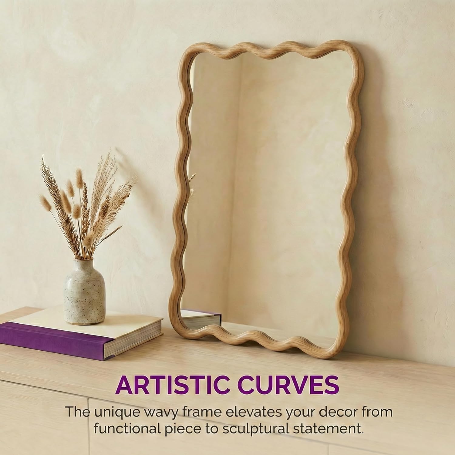 Looking for a statement piece that transforms a blank wall into a focal point of artistry and light? Our Wavy Rectangle Mirror is more than just a mirror—it's a wall sculpture. Handcrafted with a uniquely contoured solid wood frame that mimics gentle waves, each piece is a one-of-a-kind work of natural art. Featuring high-quality, distortion-free tempered glass, it offers a crystal-clear reflection. Whether hung vertically or horizontally in your entryway, living room, or above the bathroom vanity, it seamlessly merges bold design with everyday function.
