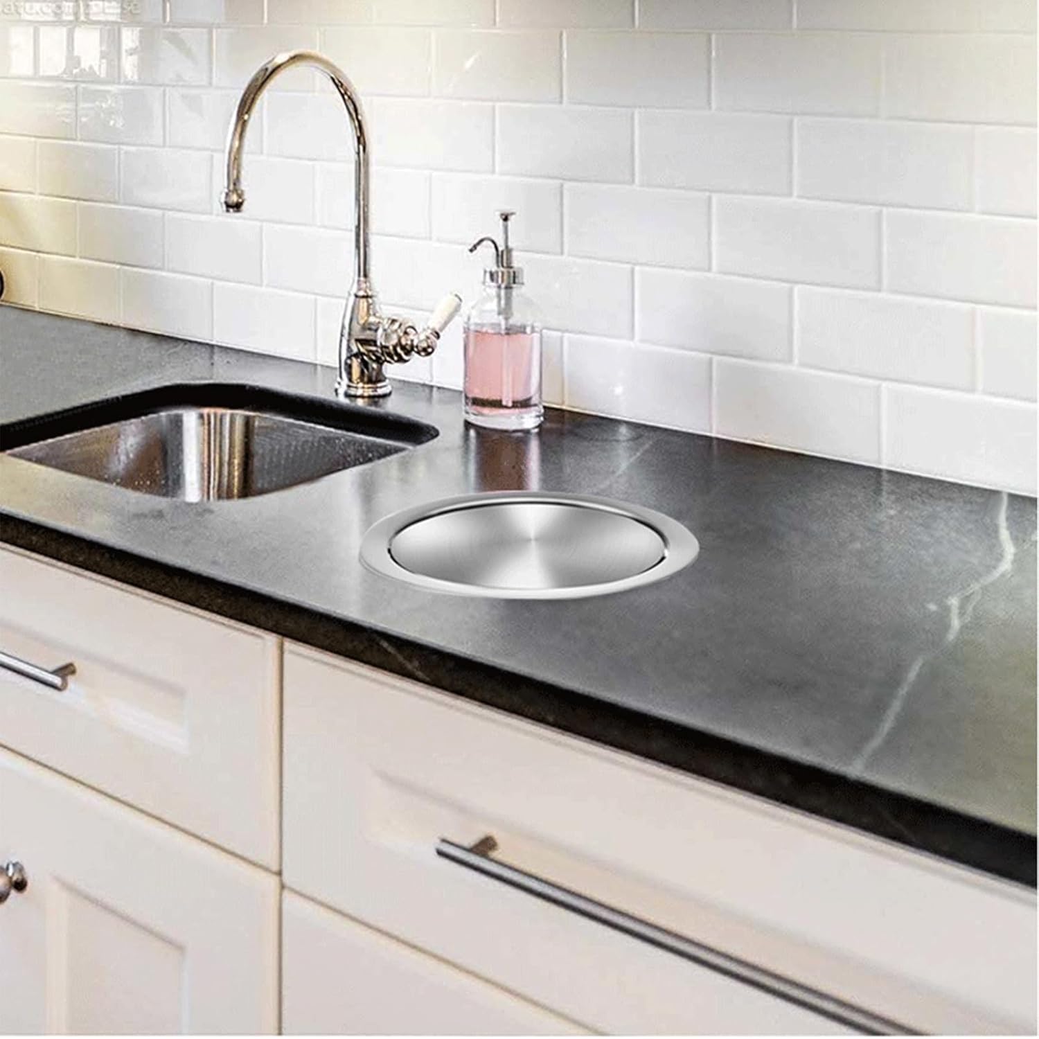 Stainless steel embedded countertop lid trash cans are not only functional kitchen equipment, but also can enhance the overall aesthetics and modernity of the kitchen. They are ideal for families pursuing high-quality life.Product Information:- Product Name: Trash can with lid- Product Material: Stainless Steel- Product Color: Silver- Product Inner Diameter: See picture above- Product Outer Diameter: See picture abovePackage Includes:1 x Trash Can Cover1 x Garbage canNOTE:Light and different displays may cause the color of the item in the picture a little different from the real thing. The measurement allowed error is +/- 1-2cm.