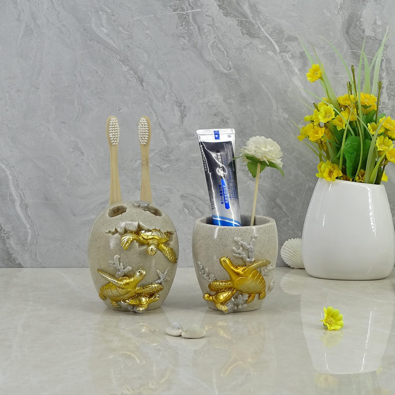 presents this mother and baby sea turtle toothbrush holder for a harmonious family environment. Love, responsibility and warmth. It conveys to the children good values and habits to last a lifetime. High 3D sculpture and beach look design, perfect for organizing your bathroom or adding free air to your room .High quality resin material, sanitary and healthy , strong body, heavy and nice, doesn't break easily . Can as a perfect gift for your families, friends, lover, colleagues, housewarming or a wedding