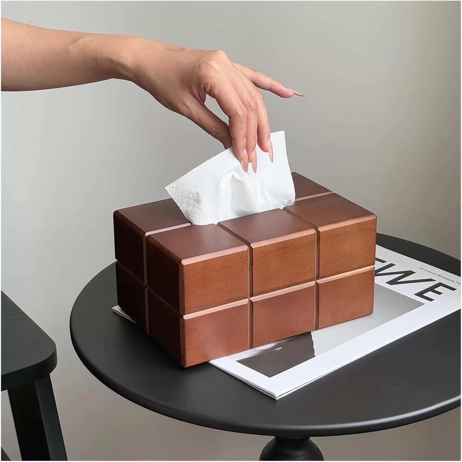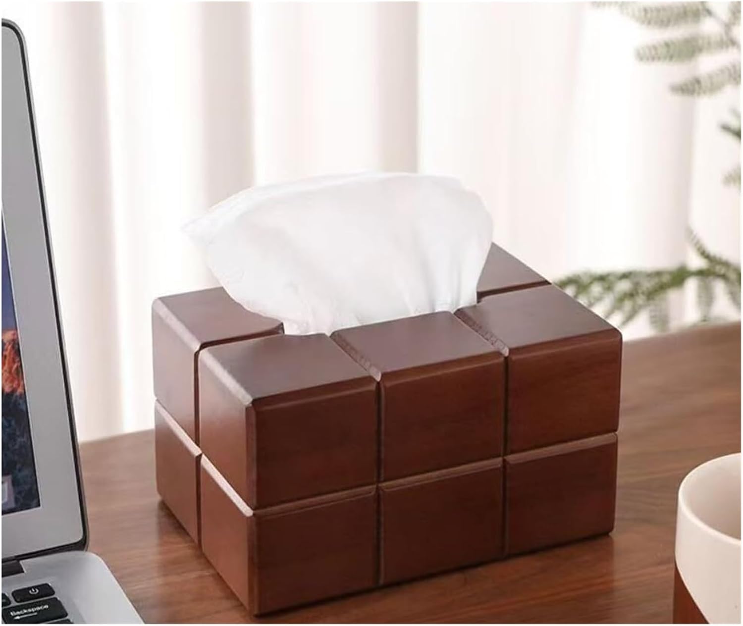 Suitable for Different Spaces - Our tissue box holder can be used in any room, from the living room and bedroom to the bathroom. The attractive storage design helps keep our living and working environments clean and convenientThis distinctive wooden tissue box cover transforms an everyday essential into a stylish decorative accent for your home or office. Featuring a unique cube block design in rich brown wood tones, this holder adds visual interest and warmth to any space. The clever geometric construction creates an eye-catching focal point on desks, nightstands, coffee tables, or bathroom counters. The thoughtfully designed opening at the top provides easy access to tissues while keeping them neatly concealed within the attractive wooden exterior. Its compact footprint makes it perfect for smaller spaces without sacrificing style. The natural wood construction offers durability and timeless appeal that complements both modern and traditional decor schemes. Whether placed in your living room, bedroom, bathroom, or workspace, this tissue box cover elevates the ordinary into something special.
