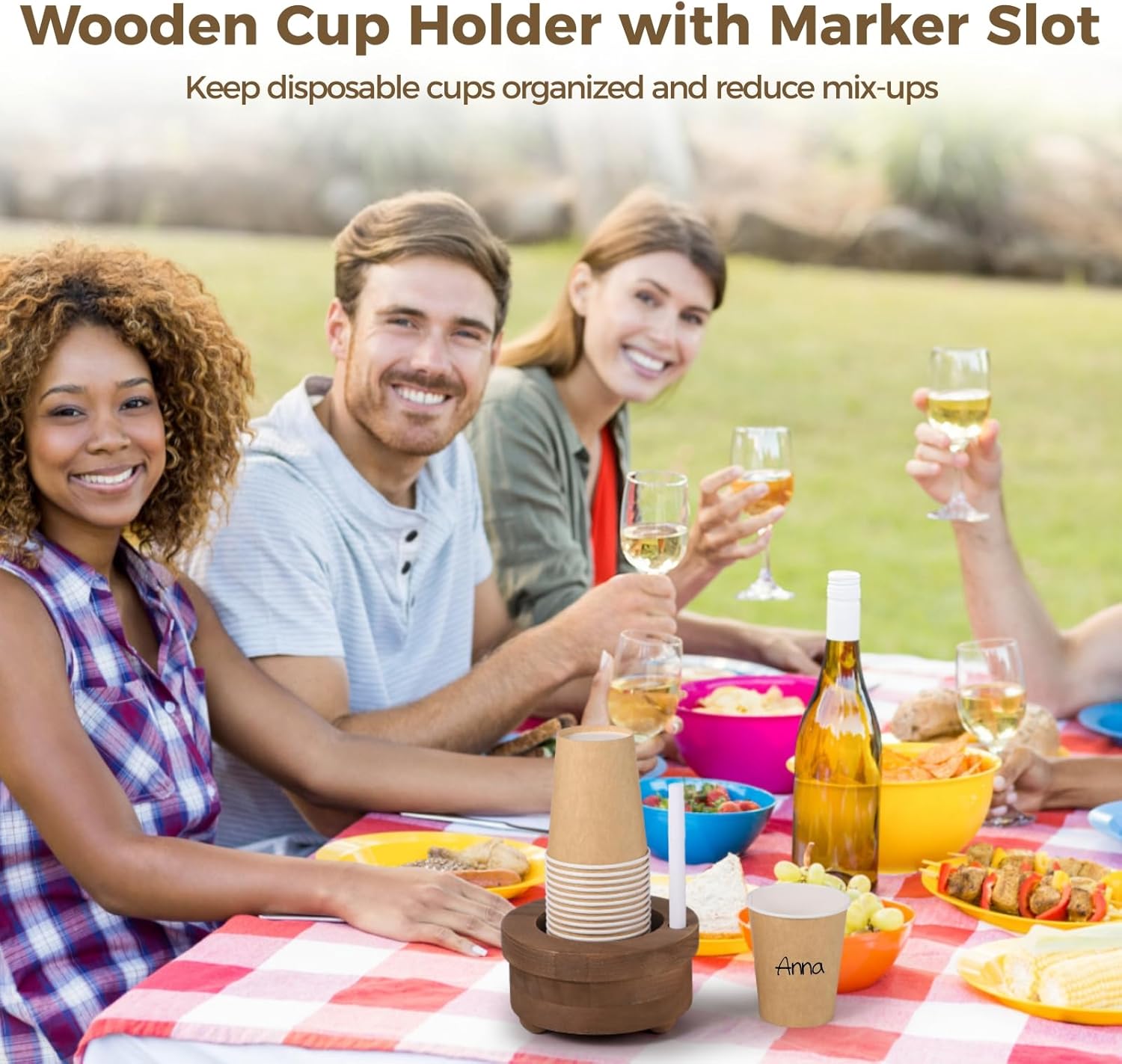 | Item Type Name | cup holder with marker slot, wooden cup holder, wood cup organizer with marker slot, mark your cup and drink up cup holder, mark your cup, wood cup dispenser with marker slot |